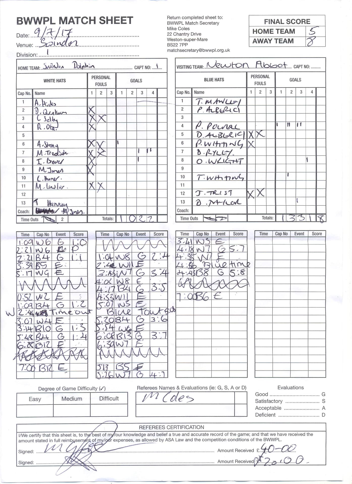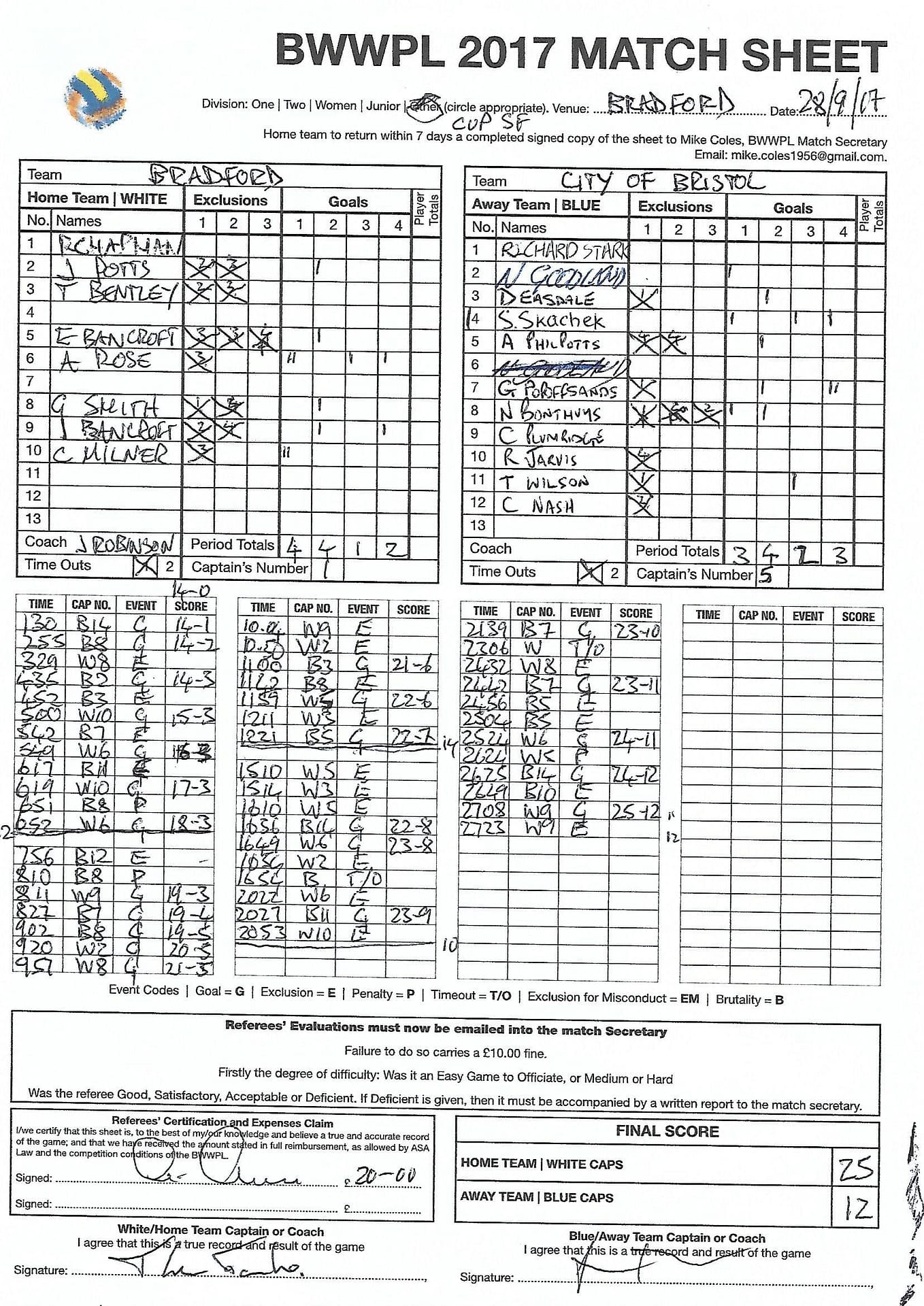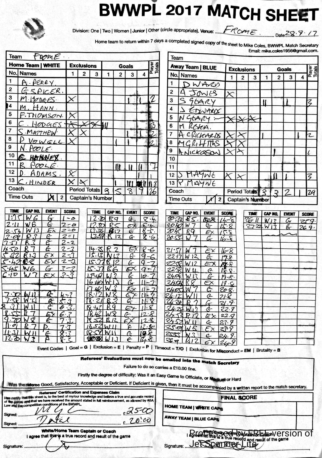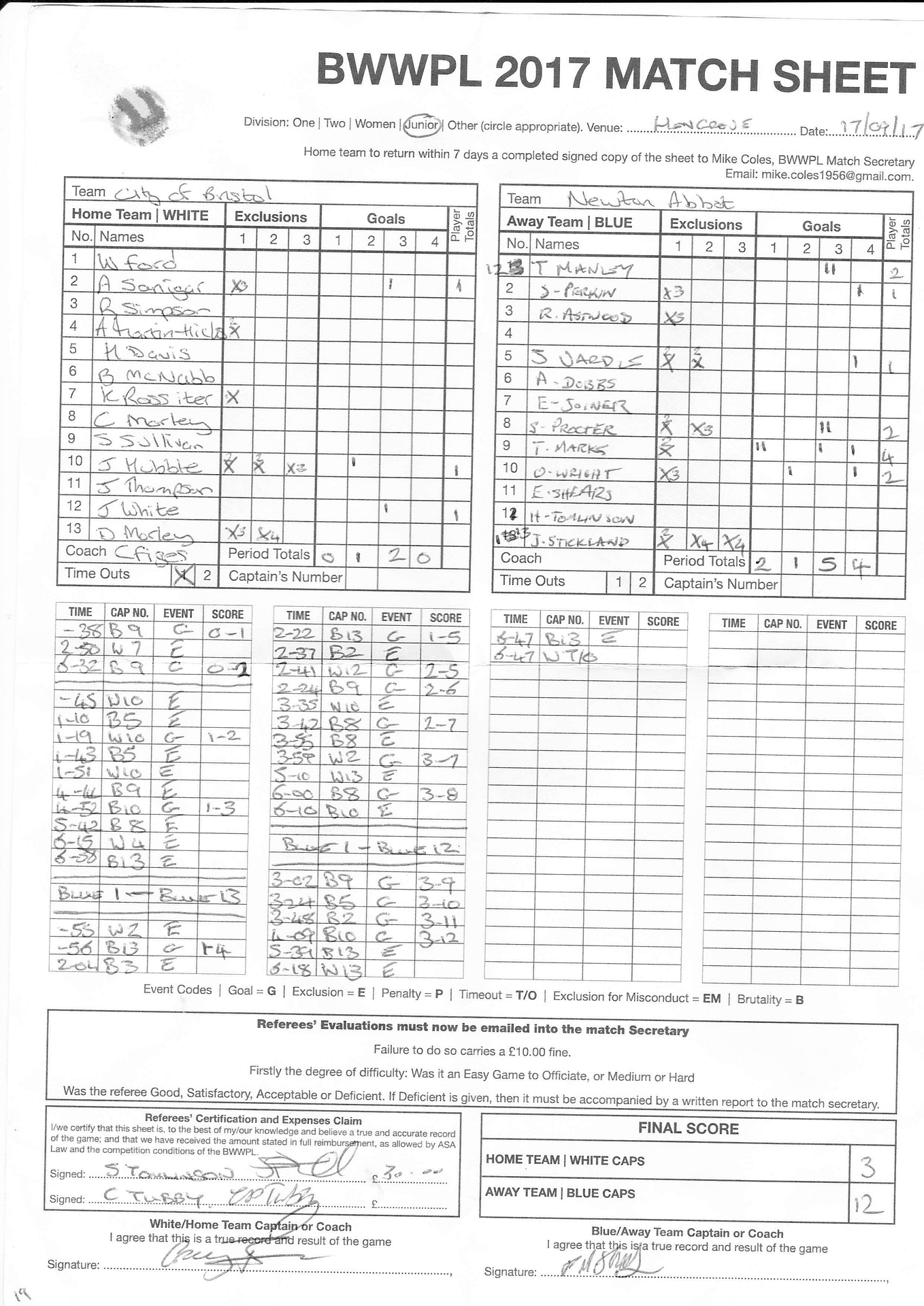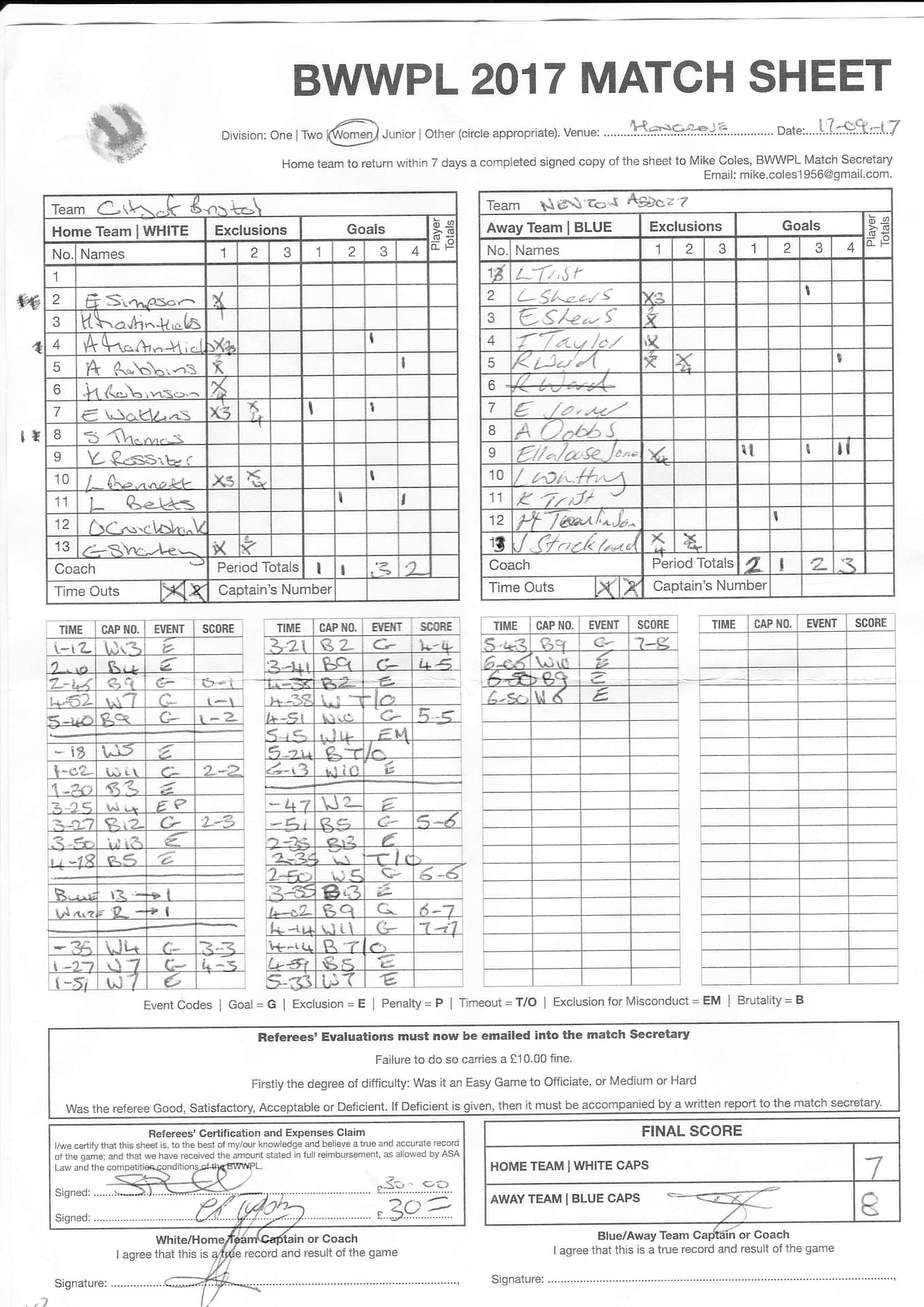 *Newton Abbot played an unregistered player during the fixture Newton Abbot v City of Bristol, 8th September 2017. Newton Abbot fined £10 but the score remains the same.
