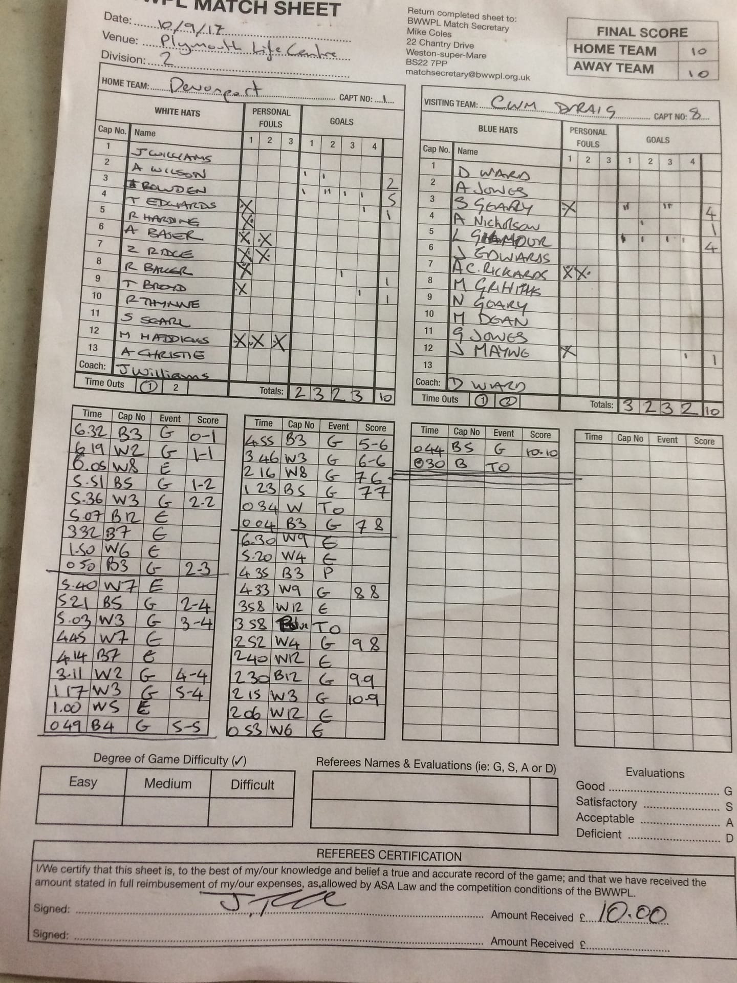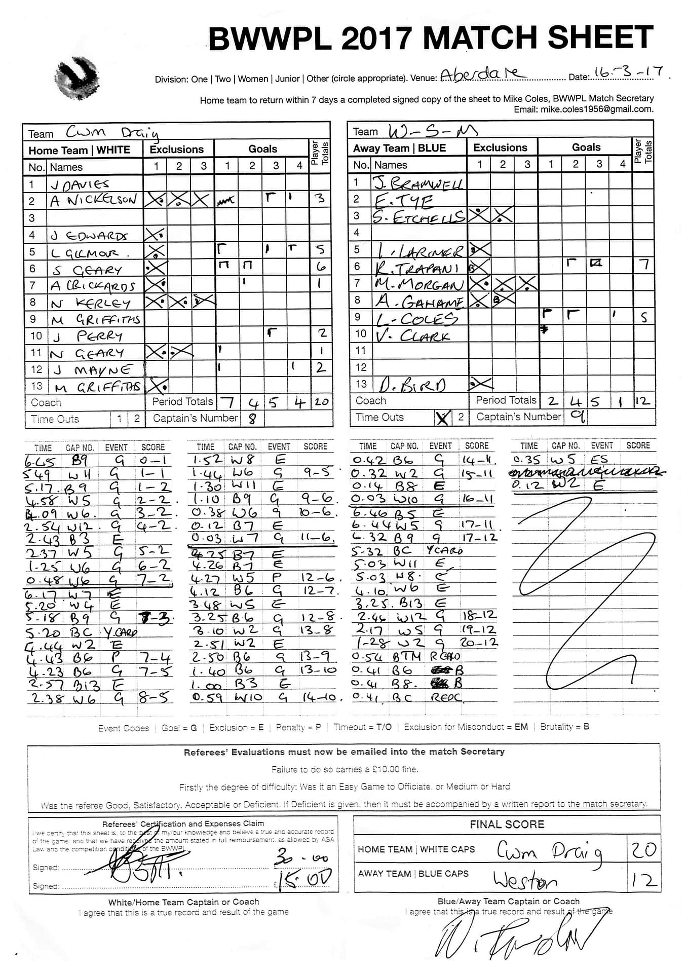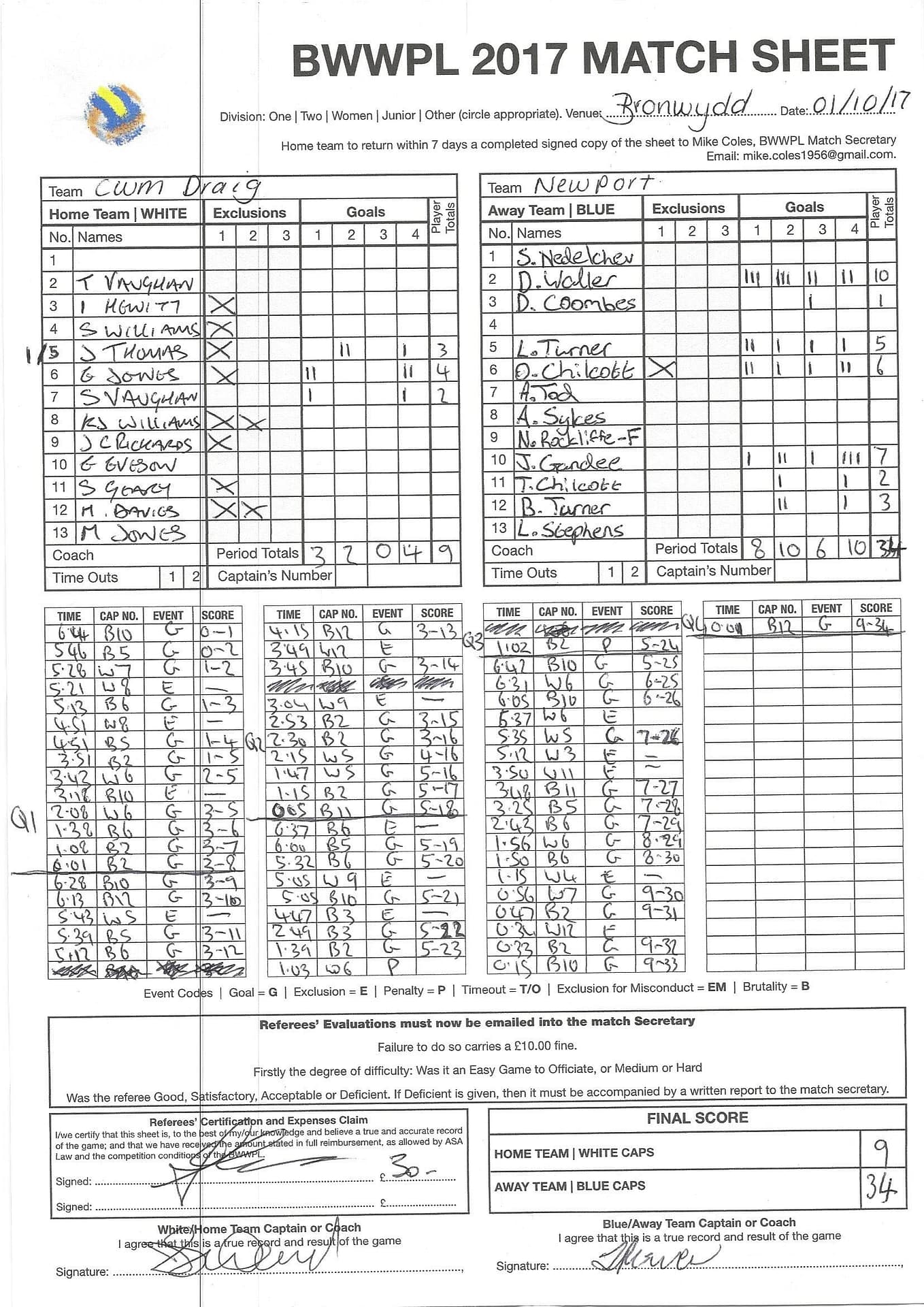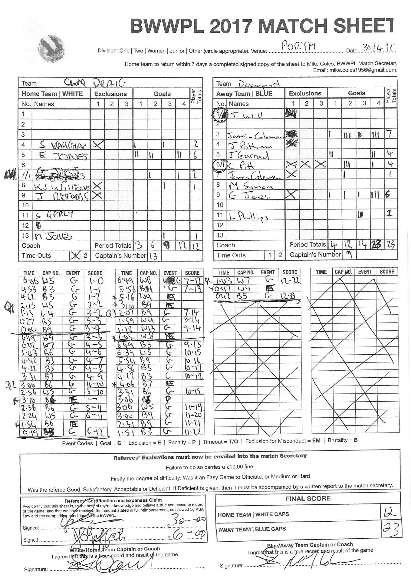 Points deducted. Two points awarded to Cwm Draig as a 0-0 score as per Rule 16.9.
