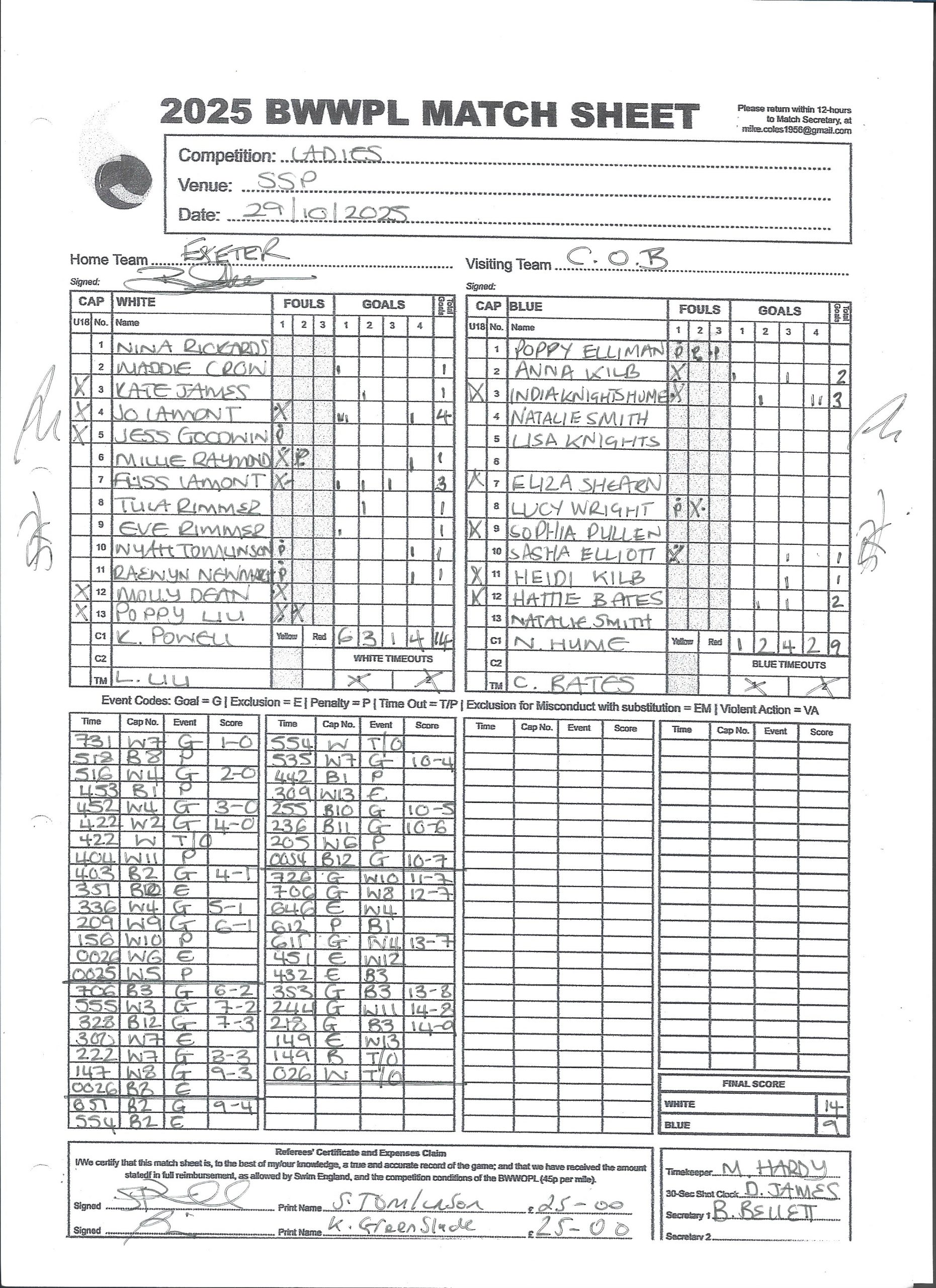 | 24 Feb | Bradford on Avon | Swansea | 11-8 | Bradford on Avon Swimming Pool | Match Sheet | 3 Mar | Bradford on Avon | Swindon Dolphin | 12-12 | Bradford on Avon Swimming Pool | Match Sheet | 5 Mar | Exeter Women | Welsh Wanderers Women | 14-8 | St Sidwell’s Point Leisure Centre, Exeter | Match Sheet | 5 Mar | City of Newport | Welsh Wanderers | 8-30 | Newport International Pool | Match Sheet | 6 Mar | City of Bristol | City of Bristol Barbarians | 18-9 | Hengrove Leisure Centre | Match Sheet | 11 Mar | Devonport Royal Woman | Newton Abbot Women | 11-11 | Plymouth Life Centre | Match Sheet | 13 Mar | City of Bristol Barbarians | City of Bristol | 11-12 | Hengrove Leisure Centre | Match Sheet | 18 Mar | City of Bristol Women | City of Newport Women | 30-2 | Hengrove Leisure Centre | Match Sheet | 20 Mar | City of Bristol Harlequins | Bradford on Avon | 12-5 | Hengrove Leisure Centre | Match Sheet | 23 Mar | Swindon Dolphin | Bradford on Avon | 11-10 | Marlborough College Swimming Pool | Match Sheet | 23 Mar | Weston-super-Mare | Newton Abbot | 10-8 | Hutton Moor Leisure Centre | Match Sheet | 24 Mar | Bradford on Avon | City of Newport II | 5-0 | Bradford on Avon Swimming Pool | Cancelled by City of Newport II | 25 Mar | Swansea | City of Bristol | 43 (32) - 25 | Wales National Pool, Swansea | Match Sheet | 25 Mar | City of Bristol Women | Welsh Wanderers Women | 12-3 | Hengrove Leisure Centre | Match Sheet | 27 Mar | City of Bristol Barbarians | Welsh Wanderers | 9-17 | Hengrove Leisure Centre | Match Sheet | 27 Mar | Exeter Women | City of Newport Women | 5-0 | St Sidwell’s Point Leisure Centre, Exeter | Cancelled by City of Newport | 1 Apr | Welsh Wanderers Women | Exeter Women | 12-19 | Cardiff International Pool | Match Sheet | 2 Apr | City of Newport | City of Bristol | 10-14 | Newport International Pool | Match Sheet | 3 Apr | City of Bristol Harlequins | Swansea | 10-9 | Hengrove Leisure Centre | Match Sheet | 6 Apr | Weston-super-Mare | Welsh Wanderers II | 16-11 | Hutton Moor Leisure Centre | Match Sheet | 8 Apr | Exeter | Devonport Royal | 21-12 | St Sidwell’s Point Leisure Centre, Exeter | Match Sheet | 12 Apr | City of Newport II | Swindon Dolphin | 13-15 | Newport International Pool | Match Sheet | 17 Apr | Welsh Wanderers II | Devonport Royal | 20-19 | Cardiff International Pool | Match Sheet | 22 Apr | Devonport Royal Woman | Exeter Women | 7-19 | Plymouth Life Centre | Match Sheet | 23 Apr | City of Newport | City of Bristol Barbarians | 13-11 | Newport International Pool | Match Sheet | 24 Apr | City of Bristol Women | Newton Abbot Women | 33-6 | Hengrove Leisure Centre | Match Sheet | 26 Apr | Devonport Royal Woman | Welsh Wanderers Women | 5-27 | Plymouth Life Centre | Match Sheet | 27 Apr | Swindon Dolphin | Bradford on Avon | 12-14 | Marlborough College Swimming Pool | Match Sheet | 30 Apr | Exeter Women | Newton Abbot Women | 24-9 | St Sidwell’s Point Leisure Centre, Exeter | Match Sheet | 1 May | Welsh Wanderers II | Exeter | 17-21 | Cardiff International Pool | Match Sheet | 1 May | City of Bristol Harlequins | City of Newport II | 14-12 | Hengrove Leisure Centre | Match Sheet | 8 May | Welsh Wanderers II | Weston-super-Mare | 15-10 | Cardiff International Pool | Match Sheet | 8 May | Frome | City of Bristol | 12-17 | Frome Sports and Fitness Centre | Match Sheet | 10 May | Devonport Royal Woman | City of Newport Women | 5-0 | Plymouth Life Centre | Match cancelled by City of Newport | 13 May | Swansea | City of Newport II | 12-10 | Wales National Pool, Swansea | Match Sheet | 13 May | Exeter | Frome | 22 - 20 (6) | St Sidwell’s Point Leisure Centre, Exeter | Match Sheet | 15 May | City of Bristol Barbarians | City of Newport | 15-8 | Hengrove Leisure Centre | Match Sheet | 18 May | Swindon Dolphin | Swansea | 6-17 | Marlborough College Swimming Pool | Match Sheet | 18 May | Weston-super-Mare | Devonport Royal | 6-14 | Hutton Moor Leisure Centre | Match Sheet | 20 May | Exeter | Newton Abbot | 14-1 | St Sidwell’s Point Leisure Centre, Exeter | Match Sheet | 22 May | Frome | City of Bristol Barbarians | 11-13 | Frome Sports and Fitness Centre | Match Sheet | 1 Jun | Weston-super-Mare | Exeter | 12-12 | Hutton Moor Leisure Centre | Match Sheet | 5 Jun | City of Bristol | Frome | 25-11 | Hengrove Leisure Centre | Match Sheet | 10 Jun | Welsh Wanderers Women | City of Newport Women | 5-0 | Cardiff International Pool | Cancelled by City of Newport | 12 Jun | City of Bristol Harlequins | Swindon Dolphin | 10-9 | Hengrove Leisure Centre | Match Sheet | 16 Jun | Welsh Wanderers II | Newton Abbot | 25-11 | Cardiff International Pool | Match Sheet | 17 Jun | Devonport Royal | Welsh Wanderers II | 16-14 | Plymouth Life Centre | Match Sheet | 19 Jun | City of Bristol Barbarians | Frome | 19-13 | Hengrove Leisure Centre | Match Sheet | 21 Jun | City of Newport II | Swansea | 3-10 | Newport International Pool | Match Sheet | 22 Jun | Swindon Dolphin | City of Bristol Harlequins | 12-4 | Marlborough College Swimming Pool | Match Sheet | 22 Jun | Newton Abbot Women | Welsh Wanderers Women | 8-17 | Kingsteignton Swimming Pool | Match Sheet | 22 Jun | Newton Abbot | Exeter | 9-16 | Kingsteignton Swimming Pool | Match Sheet | 29 Jun | Swindon Dolphin | City of Newport II | 11-10 | Marlborough College Swimming Pool | Match Sheet | 29 Jun | Newton Abbot | Welsh Wanderers II | 16-10 | Kingsteignton Swimming Pool | Match Sheet | 29 Jun | Weston-super-Mare | City of Newport | 14 (4) - 23 | Hutton Moor Leisure Centre | Match Sheet | 30 Jun | Exeter Women | Devonport Royal Woman | 5-0 | St Sidwell’s Point Leisure Centre, Exeter | Game cancelled by Devonport Royal | 1 Jul | Exeter | Weston-super-Mare | 21-8 | St Sidwell’s Point Leisure Centre, Exeter | Match Sheet | 5 Jul | City of Newport Women | Devonport Royal Woman | 5-0 | Newport International Pool | Cancelled by Devonport Royal | 6 Jul | Newton Abbot Women | City of Newport Women | 5-0 | Kingsteignton Swimming Pool |