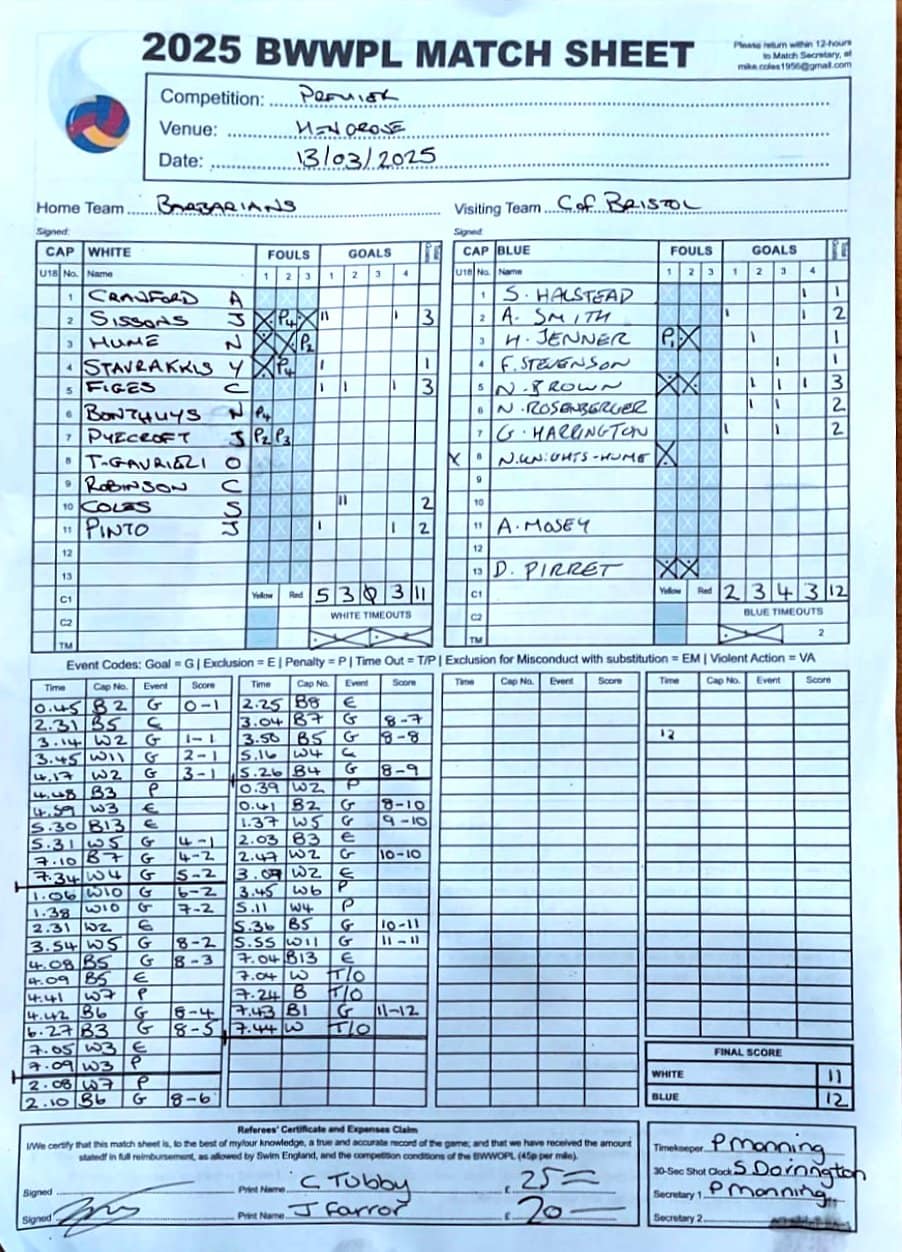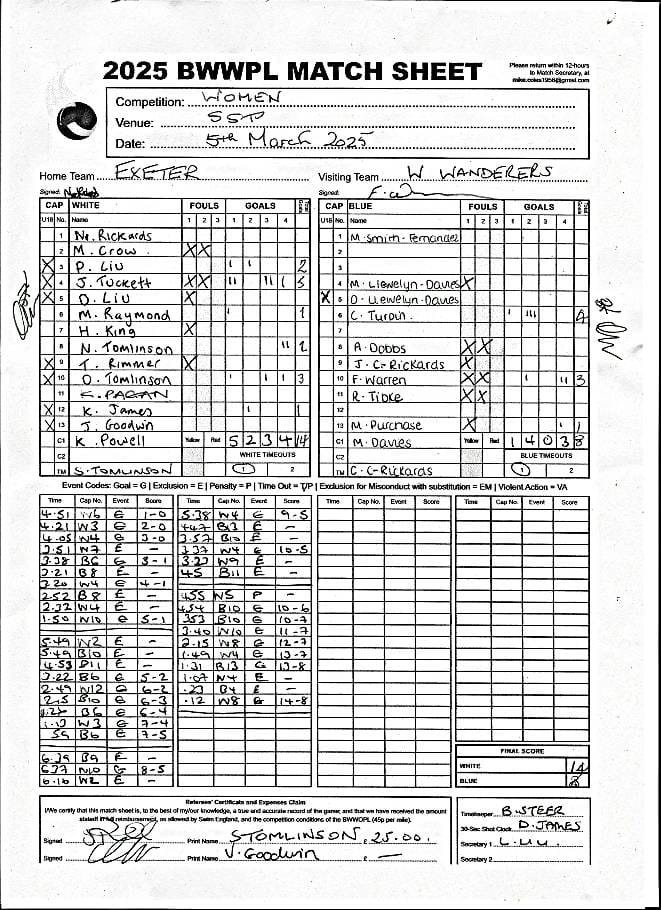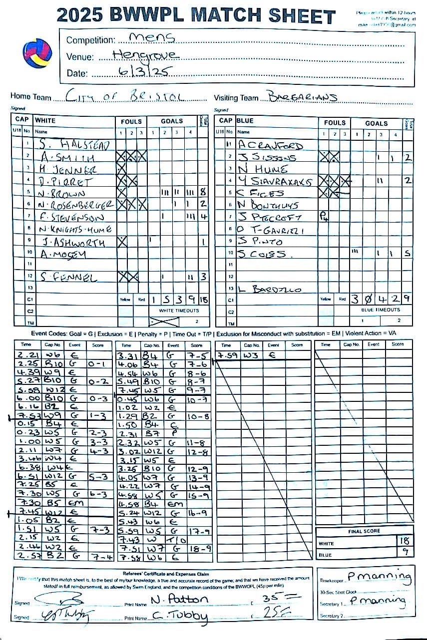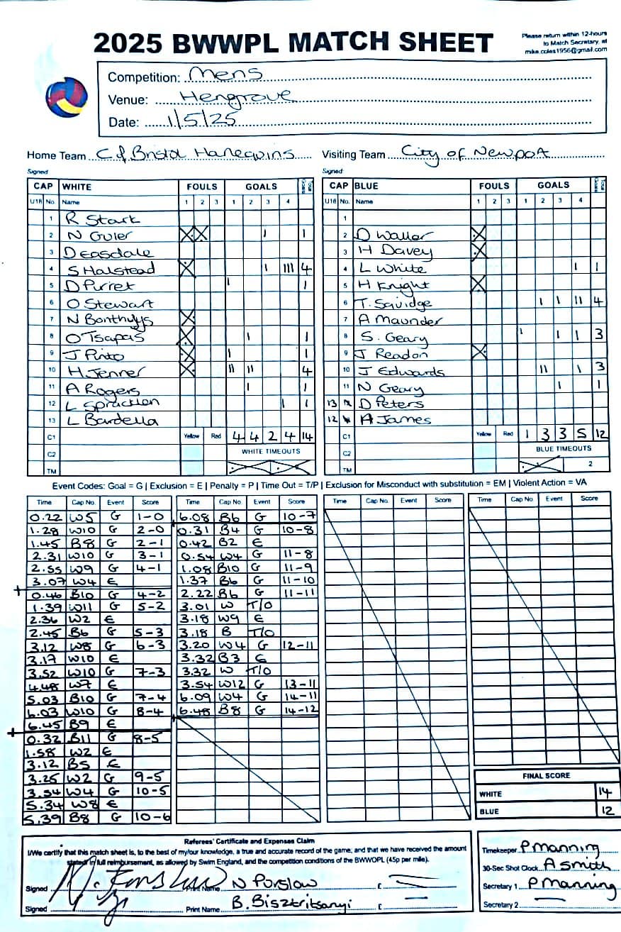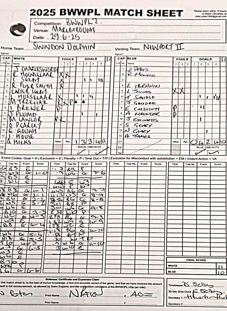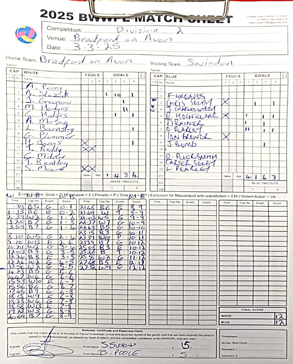 | Date | Home | Away | Time/Score | Pool | Division/Refs/Sheet | Mon, 24 Feb 25 | Bradford on Avon | Swansea | 11-8 | Bradford on Avon Swimming Pool | Match Sheet | Mon, 3 Mar 25 | Bradford on Avon | Swindon Dolphin | 12-12 | Bradford on Avon Swimming Pool | Match Sheet | Wed, 5 Mar 25 | Exeter Women | Welsh Wanderers Women | 14-8 | St Sidwell’s Point Leisure Centre, Exeter | Match Sheet | Wed, 5 Mar 25 | City of Newport | Welsh Wanderers | 8-30 | Newport International Pool | Match Sheet | Thr, 6 Mar 25 | City of Bristol | City of Bristol Barbarians | 18-9 | Hengrove Leisure Centre | Match Sheet | Tue, 11 Mar 25 | Devonport Royal Woman | Newton Abbot Women | 11-11 | Plymouth Life Centre | Match Sheet | Thr, 13 Mar 25 | City of Bristol Barbarians | City of Bristol | 11-12 | Hengrove Leisure Centre | Match Sheet | Tue, 18 Mar 25 | City of Bristol Women | City of Newport Women | 30-2 | Hengrove Leisure Centre | Match Sheet | Thr, 20 Mar 25 | City of Bristol Harlequins | Bradford on Avon | 12-5 | Hengrove Leisure Centre | Match Sheet | Sun, 23 Mar 25 | Swindon Dolphin | Bradford on Avon | 11-10 | Marlborough College Swimming Pool | Match Sheet | Sun, 23 Mar 25 | Weston-super-Mare | Newton Abbot | 10-8 | Hutton Moor Leisure Centre | Match Sheet | Mon, 24 Mar 25 | Bradford on Avon | City of Newport II | 5-0 | Bradford on Avon Swimming Pool | Cancelled by City of Newport II | Tue, 25 Mar 25 | Swansea | City of Bristol | 43 (32) - 25 | Wales National Pool, Swansea | Match Sheet | Tue, 25 Mar 25 | City of Bristol Women | Welsh Wanderers Women | 12-3 | Hengrove Leisure Centre | Match Sheet | Thr, 27 Mar 25 | City of Bristol Barbarians | Welsh Wanderers | 9-17 | Hengrove Leisure Centre | Match Sheet | Thr, 27 Mar 25 | Exeter Women | City of Newport Women | 5-0 | St Sidwell’s Point Leisure Centre, Exeter | Cancelled by City of Newport | Tue, 1 Apr 25 | Welsh Wanderers Women | Exeter Women | 12-19 | Cardiff International Pool | Match Sheet | Wed, 2 Apr 25 | City of Newport | City of Bristol | 10-14 | Newport International Pool | Match Sheet | Thr, 3 Apr 25 | City of Bristol Harlequins | Swansea | 10-9 | Hengrove Leisure Centre | Match Sheet | Sun, 6 Apr 25 | Weston-super-Mare | Welsh Wanderers II | 16-11 | Hutton Moor Leisure Centre | Match Sheet | Tue, 8 Apr 25 | Exeter | Devonport Royal | 21-12 | St Sidwell’s Point Leisure Centre, Exeter | Match Sheet | Sat, 12 Apr 25 | City of Newport II | Swindon Dolphin | 13-15 | Newport International Pool | Match Sheet | Thr, 17 Apr 25 | Welsh Wanderers II | Devonport Royal | 20-19 | Cardiff International Pool | Match Sheet | Tue, 22 Apr 25 | Devonport Royal Woman | Exeter Women | 7-19 | Plymouth Life Centre | Match Sheet | Wed, 23 Apr 25 | City of Newport | City of Bristol Barbarians | 13-11 | Newport International Pool | Match Sheet | Thr, 24 Apr 25 | City of Bristol Women | Newton Abbot Women | 33-6 | Hengrove Leisure Centre | Match Sheet | Sat, 26 Apr 25 | Devonport Royal Woman | Welsh Wanderers Women | 5-27 | Plymouth Life Centre | Match Sheet | Sun, 27 Apr 25 | Swindon Dolphin | Bradford on Avon | 12-14 | Marlborough College Swimming Pool | Match Sheet | Wed, 30 Apr 25 | Exeter Women | Newton Abbot Women | 24-9 | St Sidwell’s Point Leisure Centre, Exeter | Match Sheet | Thr, 1 May 25 | Welsh Wanderers II | Exeter | 17-21 | Cardiff International Pool | Match Sheet | Thr, 1 May 25 | City of Bristol Harlequins | City of Newport II | 14-12 | Hengrove Leisure Centre | Match Sheet | Thr, 8 May 25 | Welsh Wanderers II | Weston-super-Mare | 15-10 | Cardiff International Pool | Match Sheet | Thr, 8 May 25 | Frome | City of Bristol | 12-17 | Frome Sports and Fitness Centre | Match Sheet | Sat, 10 May 25 | Devonport Royal Woman | City of Newport Women | 5-0 | Plymouth Life Centre | Match cancelled by City of Newport | Tue, 13 May 25 | Swansea | City of Newport II | 12-10 | Wales National Pool, Swansea | Match Sheet | Tue, 13 May 25 | Exeter | Frome | 22 - 20 (6) | St Sidwell’s Point Leisure Centre, Exeter | Match Sheet | Thr, 15 May 25 | City of Bristol Barbarians | City of Newport | 15-8 | Hengrove Leisure Centre | Match Sheet | Sun, 18 May 25 | Swindon Dolphin | Swansea | 6-17 | Marlborough College Swimming Pool | Match Sheet | Sun, 18 May 25 | Weston-super-Mare | Devonport Royal | 6-14 | Hutton Moor Leisure Centre | Match Sheet | Tue, 20 May 25 | Exeter | Newton Abbot | 14-1 | St Sidwell’s Point Leisure Centre, Exeter | Match Sheet | Thr, 22 May 25 | Frome | City of Bristol Barbarians | 11-13 | Frome Sports and Fitness Centre | Match Sheet | Sun, 1 Jun 25 | Weston-super-Mare | Exeter | 12-12 | Hutton Moor Leisure Centre | Match Sheet | Thr, 5 Jun 25 | City of Bristol | Frome | 25-11 | Hengrove Leisure Centre | Match Sheet | Tue, 10 Jun 25 | Welsh Wanderers Women | City of Newport Women | 5-0 | Cardiff International Pool | Cancelled by City of Newport | Thr, 12 Jun 25 | City of Bristol Harlequins | Swindon Dolphin | 10-9 | Hengrove Leisure Centre | Match Sheet | Mon, 16 Jun 25 | Welsh Wanderers II | Newton Abbot | 25-11 | Cardiff International Pool | Match Sheet | Tue, 17 Jun 25 | Devonport Royal | Welsh Wanderers II | 16-14 | Plymouth Life Centre | Match Sheet | Thr, 19 Jun 25 | City of Bristol Barbarians | Frome | 19-13 | Hengrove Leisure Centre | Match Sheet | Sat, 21 Jun 25 | City of Newport II | Swansea | 3-10 | Newport International Pool | Match Sheet | Sun, 22 Jun 25 | Swindon Dolphin | City of Bristol Harlequins | 12-4 | Marlborough College Swimming Pool | Match Sheet | Sun, 22 Jun 25 | Newton Abbot Women | Welsh Wanderers Women | 8-17 | Kingsteignton Swimming Pool | Match Sheet | Sun, 22 Jun 25 | Newton Abbot | Exeter | 9-16 | Kingsteignton Swimming Pool | Match Sheet | Sun, 29 Jun 25 | Swindon Dolphin | City of Newport II | 11-10 | Marlborough College Swimming Pool | Match Sheet | Sun, 29 Jun 25 | Newton Abbot | Welsh Wanderers II | 16-10 | Kingsteignton Swimming Pool | Match Sheet | Sun, 29 Jun 25 | Weston-super-Mare | City of Newport | 14 (