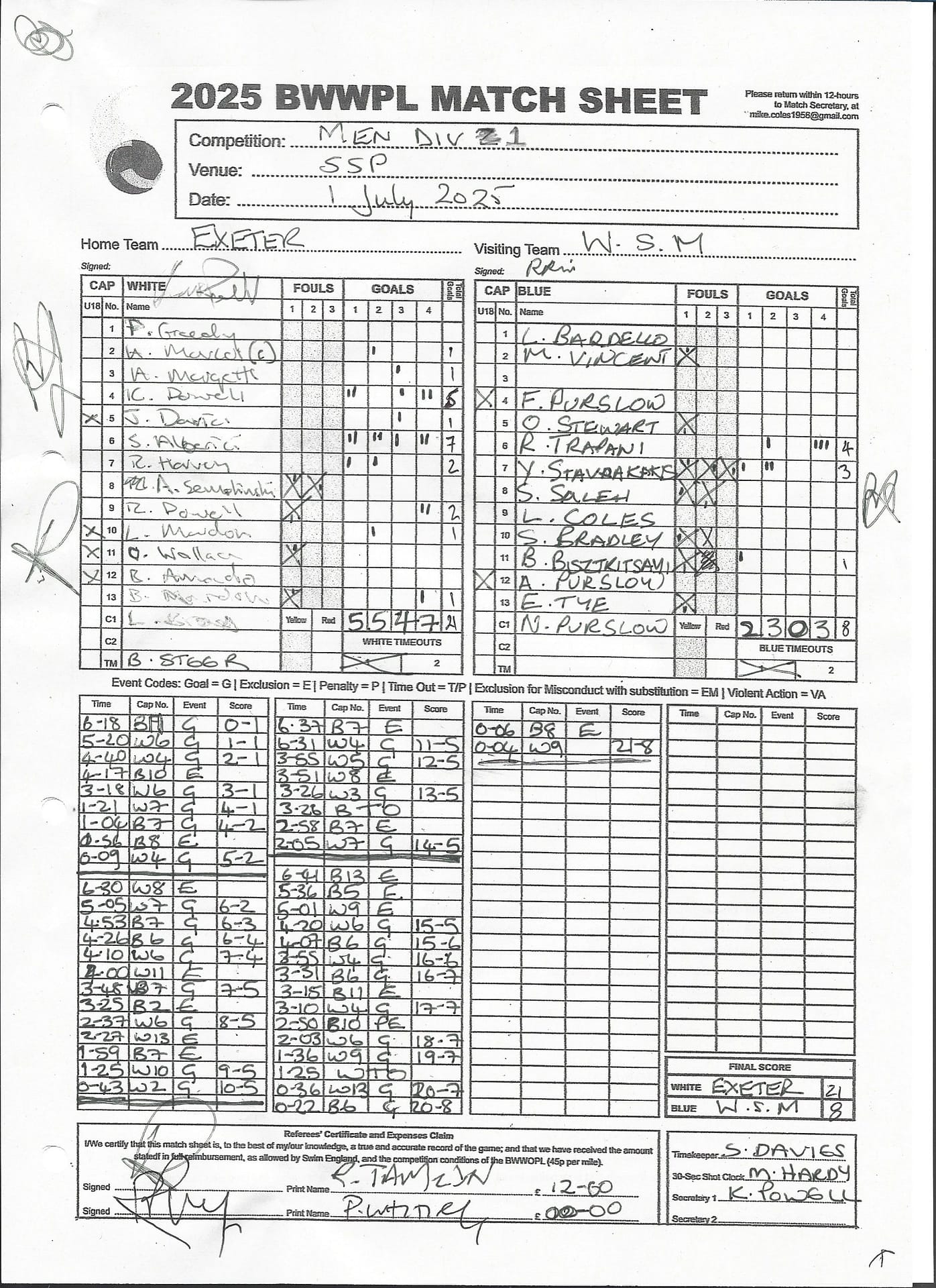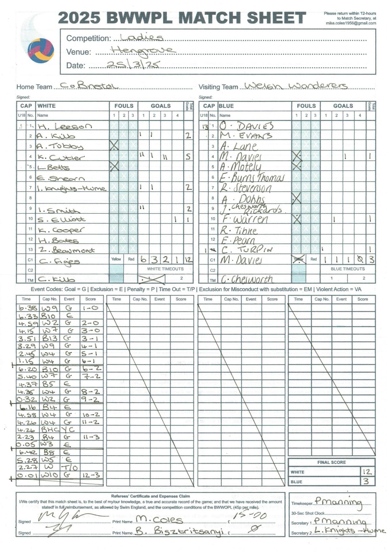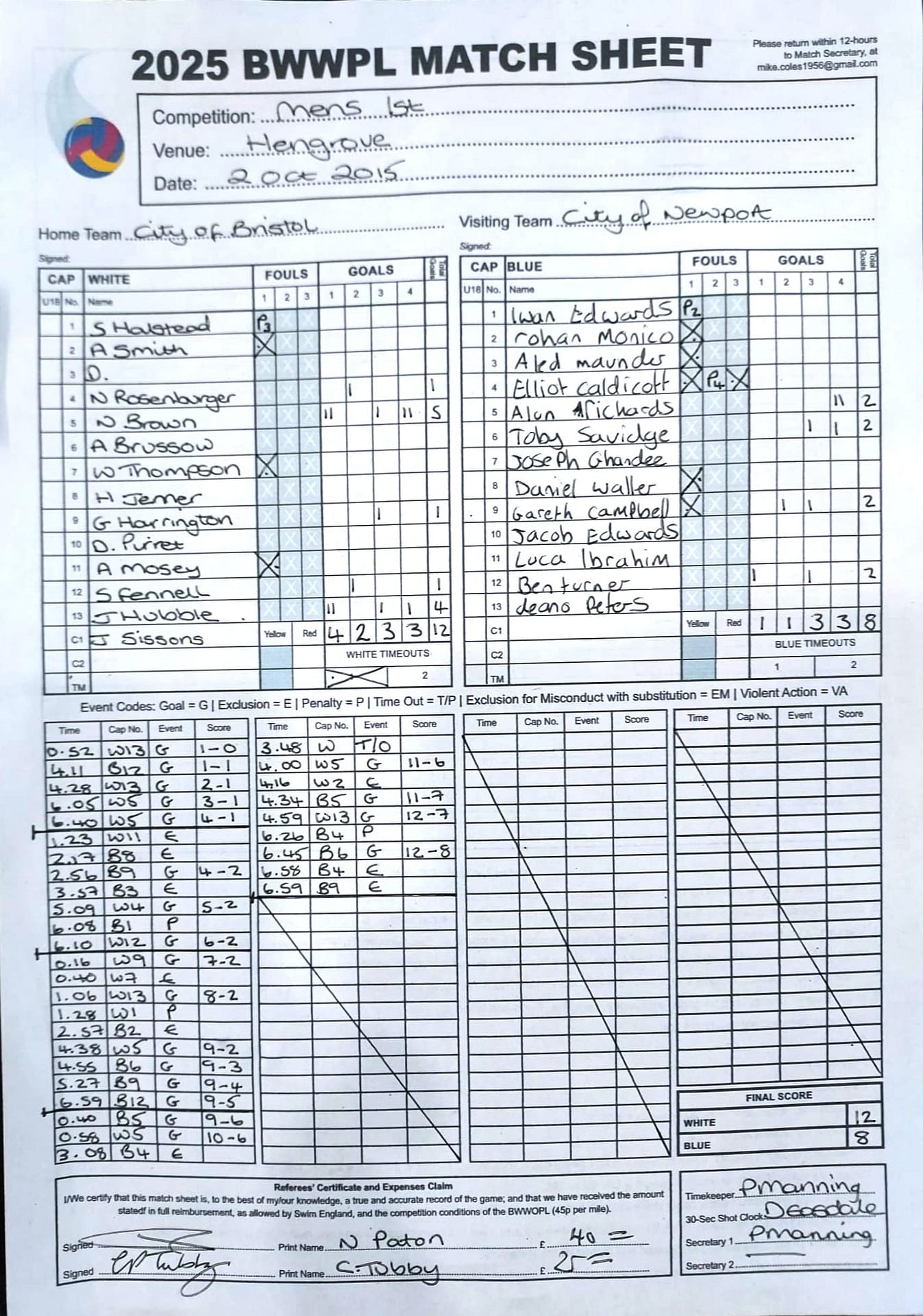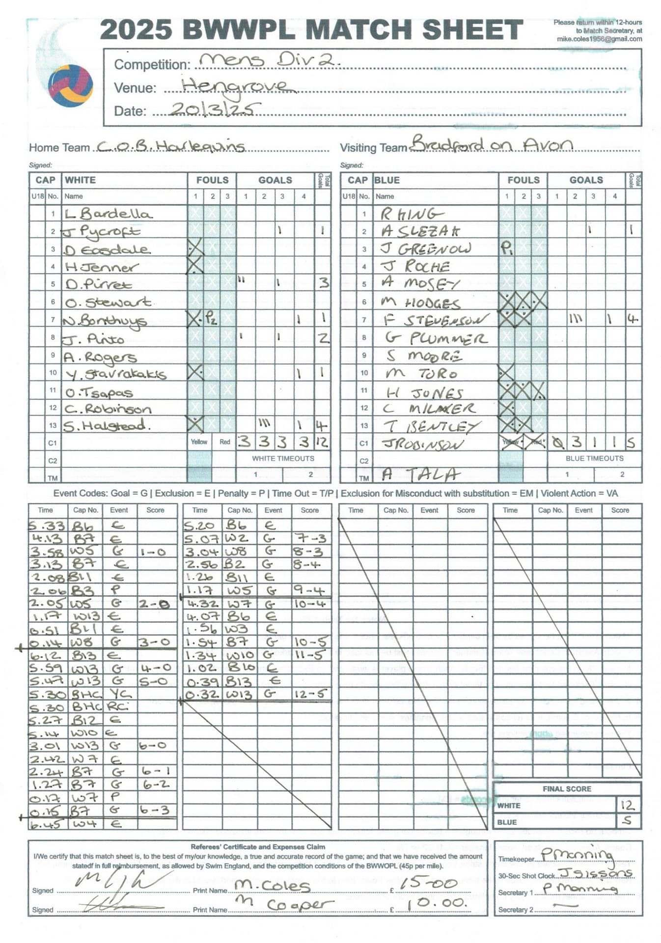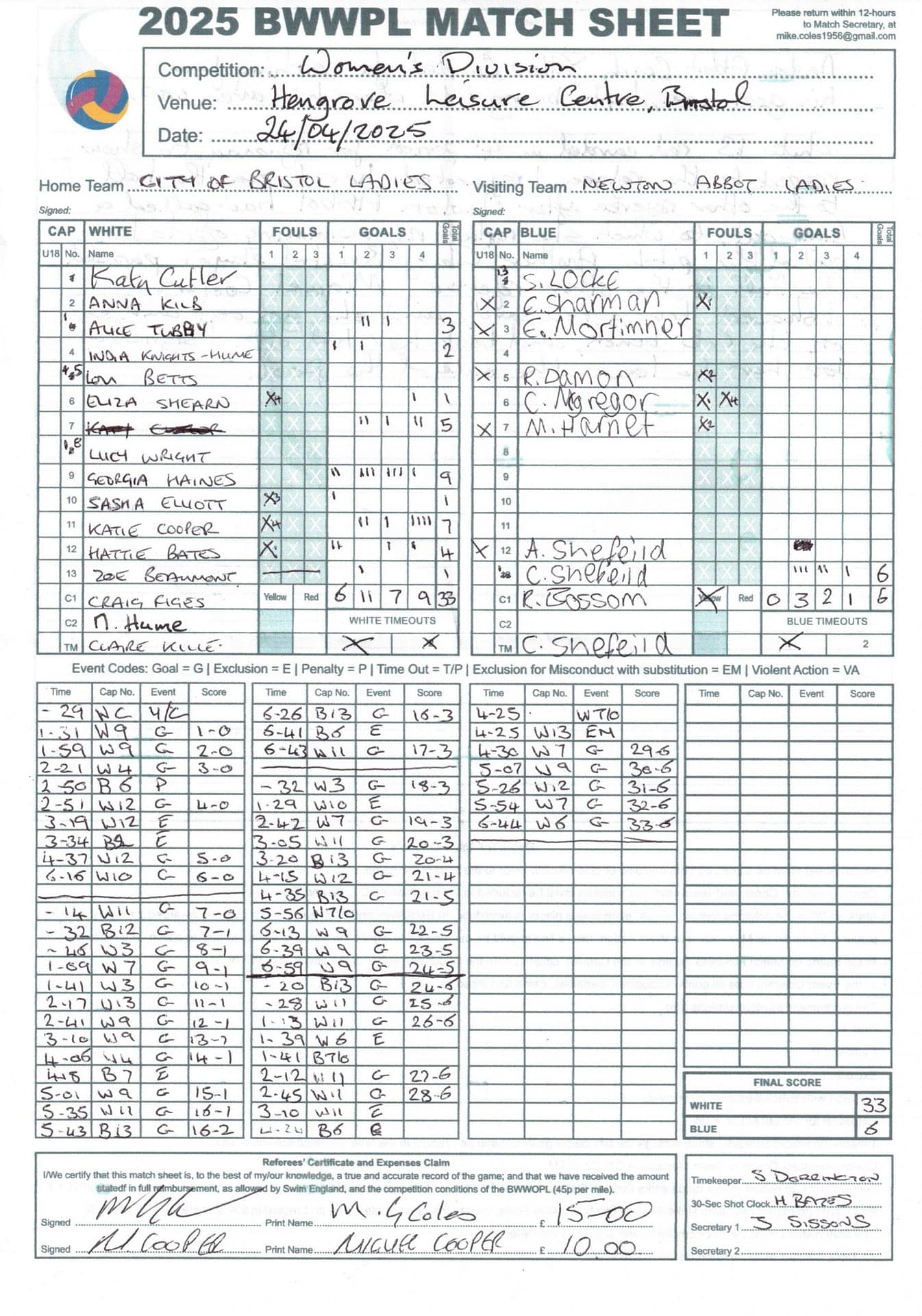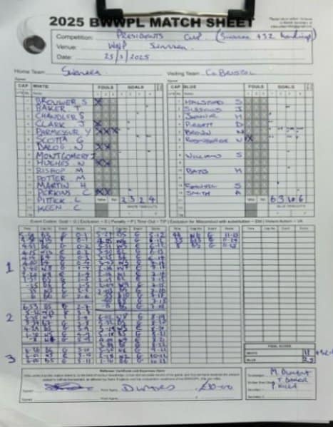 | Date | Home | Away | Time/Score | Pool | Division/Refs/Sheet | Mon, 24 Feb 25 | Bradford on Avon | Swansea | 11-8 | Bradford on Avon Swimming Pool | Match Sheet | Mon, 3 Mar 25 | Bradford on Avon | Swindon Dolphin | 12-12 | Bradford on Avon Swimming Pool | Match Sheet | Wed, 5 Mar 25 | Exeter Women | Welsh Wanderers Women | 14-8 | St Sidwell’s Point Leisure Centre, Exeter | Match Sheet | Wed, 5 Mar 25 | City of Newport | Welsh Wanderers | 8-30 | Newport International Pool | Match Sheet | Thr, 6 Mar 25 | City of Bristol | City of Bristol Barbarians | 18-9 | Hengrove Leisure Centre | Match Sheet | Tue, 11 Mar 25 | Devonport Royal Woman | Newton Abbot Women | 11-11 | Plymouth Life Centre | Match Sheet | Thr, 13 Mar 25 | City of Bristol Barbarians | City of Bristol | 11-12 | Hengrove Leisure Centre | Match Sheet | Tue, 18 Mar 25 | City of Bristol Women | City of Newport Women | 30-2 | Hengrove Leisure Centre | Match Sheet | Thr, 20 Mar 25 | City of Bristol Harlequins | Bradford on Avon | 12-5 | Hengrove Leisure Centre | Match Sheet | Sun, 23 Mar 25 | Swindon Dolphin | Bradford on Avon | 11-10 | Marlborough College Swimming Pool | Match Sheet | Sun, 23 Mar 25 | Weston-super-Mare | Newton Abbot | 10-8 | Hutton Moor Leisure Centre | Match Sheet | Mon, 24 Mar 25 | Bradford on Avon | City of Newport II | 5-0 | Bradford on Avon Swimming Pool | Cancelled by City of Newport II | Tue, 25 Mar 25 | Swansea | City of Bristol | 43 (32) - 25 | Wales National Pool, Swansea | Match Sheet | Tue, 25 Mar 25 | City of Bristol Women | Welsh Wanderers Women | 12-3 | Hengrove Leisure Centre | Match Sheet | Thr, 27 Mar 25 | City of Bristol Barbarians | Welsh Wanderers | 9-17 | Hengrove Leisure Centre | Match Sheet | Thr, 27 Mar 25 | Exeter Women | City of Newport Women | 5-0 | St Sidwell’s Point Leisure Centre, Exeter | Cancelled by City of Newport | Tue, 1 Apr 25 | Welsh Wanderers Women | Exeter Women | 12-19 | Cardiff International Pool | Match Sheet | Wed, 2 Apr 25 | City of Newport | City of Bristol | 10-14 | Newport International Pool | Match Sheet | Thr, 3 Apr 25 | City of Bristol Harlequins | Swansea | 10-9 | Hengrove Leisure Centre | Match Sheet | Sun, 6 Apr 25 | Weston-super-Mare | Welsh Wanderers II | 16-11 | Hutton Moor Leisure Centre | Match Sheet | Tue, 8 Apr 25 | Exeter | Devonport Royal | 21-12 | St Sidwell’s Point Leisure Centre, Exeter | Match Sheet | Sat, 12 Apr 25 | City of Newport II | Swindon Dolphin | 13-15 | Newport International Pool | Match Sheet | Thr, 17 Apr 25 | Welsh Wanderers II | Devonport Royal | 20-19 | Cardiff International Pool | Match Sheet | Tue, 22 Apr 25 | Devonport Royal Woman | Exeter Women | 7-19 | Plymouth Life Centre | Match Sheet | Wed, 23 Apr 25 | City of Newport | City of Bristol Barbarians | 13-11 | Newport International Pool | Match Sheet | Thr, 24 Apr 25 | City of Bristol Women | Newton Abbot Women | 33-6 | Hengrove Leisure Centre | Match Sheet | Sat, 26 Apr 25 | Devonport Royal Woman | Welsh Wanderers Women | 5-27 | Plymouth Life Centre | Match Sheet | Sun, 27 Apr 25 | Swindon Dolphin | Bradford on Avon | 12-14 | Marlborough College Swimming Pool | Match Sheet | Wed, 30 Apr 25 | Exeter Women | Newton Abbot Women | 24-9 | St Sidwell’s Point Leisure Centre, Exeter | Match Sheet | Thr, 1 May 25 | Welsh Wanderers II | Exeter | 17-21 | Cardiff International Pool | Match Sheet | Thr, 1 May 25 | City of Bristol Harlequins | City of Newport II | 14-12 | Hengrove Leisure Centre | Match Sheet | Thr, 8 May 25 | Welsh Wanderers II | Weston-super-Mare | 15-10 | Cardiff International Pool | Match Sheet | Thr, 8 May 25 | Frome | City of Bristol | 12-17 | Frome Sports and Fitness Centre | Match Sheet | Sat, 10 May 25 | Devonport Royal Woman | City of Newport Women | 5-0 | Plymouth Life Centre | Match cancelled by City of Newport | Tue, 13 May 25 | Swansea | City of Newport II | 12-10 | Wales National Pool, Swansea | Match Sheet | Tue, 13 May 25 | Exeter | Frome | 22 - 20 (6) | St Sidwell’s Point Leisure Centre, Exeter | Match Sheet | Thr, 15 May 25 | City of Bristol Barbarians | City of Newport | 15-8 | Hengrove Leisure Centre | Match Sheet | Sun, 18 May 25 | Swindon Dolphin | Swansea | 6-17 | Marlborough College Swimming Pool | Match Sheet | Sun, 18 May 25 | Weston-super-Mare | Devonport Royal | 6-14 | Hutton Moor Leisure Centre | Match Sheet | Tue, 20 May 25 | Exeter | Newton Abbot | 14-1 | St Sidwell’s Point Leisure Centre, Exeter | Match Sheet | Thr, 22 May 25 | Frome | City of Bristol Barbarians | 11-13 | Frome Sports and Fitness Centre | Match Sheet | Sun, 1 Jun 25 | Weston-super-Mare | Exeter | 12-12 | Hutton Moor Leisure Centre | Match Sheet | Thr, 5 Jun 25 | City of Bristol | Frome | 25-11 | Hengrove Leisure Centre | Match Sheet | Tue, 10 Jun 25 | Welsh Wanderers Women | City of Newport Women | 5-0 | Cardiff International Pool | Cancelled by City of Newport | Thr, 12 Jun 25 | City of Bristol Harlequins | Swindon Dolphin | 10-9 | Hengrove Leisure Centre | Match Sheet | Mon, 16 Jun 25 | Welsh Wanderers II | Newton Abbot | 25-11 | Cardiff International Pool | Match Sheet | Tue, 17 Jun 25 | Devonport Royal | Welsh Wanderers II | 16-14 | Plymouth Life Centre | Match Sheet | Thr, 19 Jun 25 | City of Bristol Barbarians | Frome | 19-13 | Hengrove Leisure Centre | Match Sheet | Sat, 21 Jun 25 | City of Newport II | Swansea | 3-10 | Newport International Pool | Match Sheet | Sun, 22 Jun 25 | Swindon Dolphin | City of Bristol Harlequins | 12-4 | Marlborough College Swimming Pool | Match Sheet | Sun, 22 Jun 25 | Newton Abbot Women | Welsh Wanderers Women | 8-17 | Kingsteignton Swimming Pool | Match Sheet | Sun, 22 Jun 25 | Newton Abbot | Exeter | 9-16 | Kingsteignton Swimming Pool | Match Sheet | Sun, 29 Jun 25 | Swindon Dolphin | City of Newport II | 11-10 | Marlborough College Swimming Pool | Match Sheet | Sun, 29 Jun 25 | Newton Abbot | Welsh Wanderers II | 16-10 | Kingsteignton Swimming Pool | Match Sheet | Sun, 29 Jun 25 | Weston-super-Mare | City of Newport | 14 (