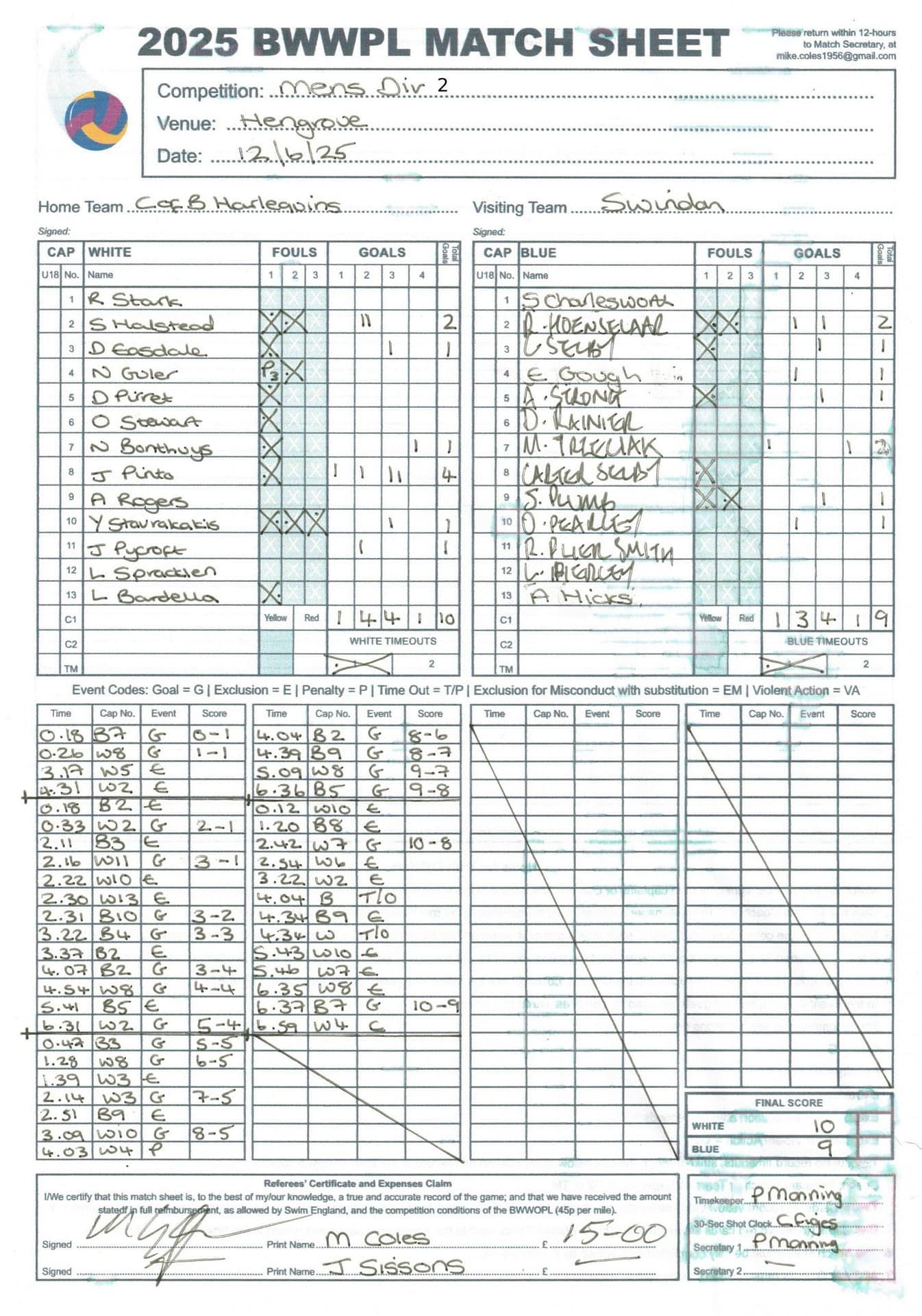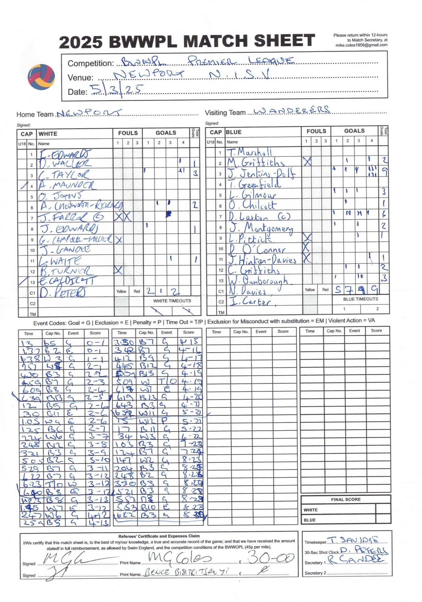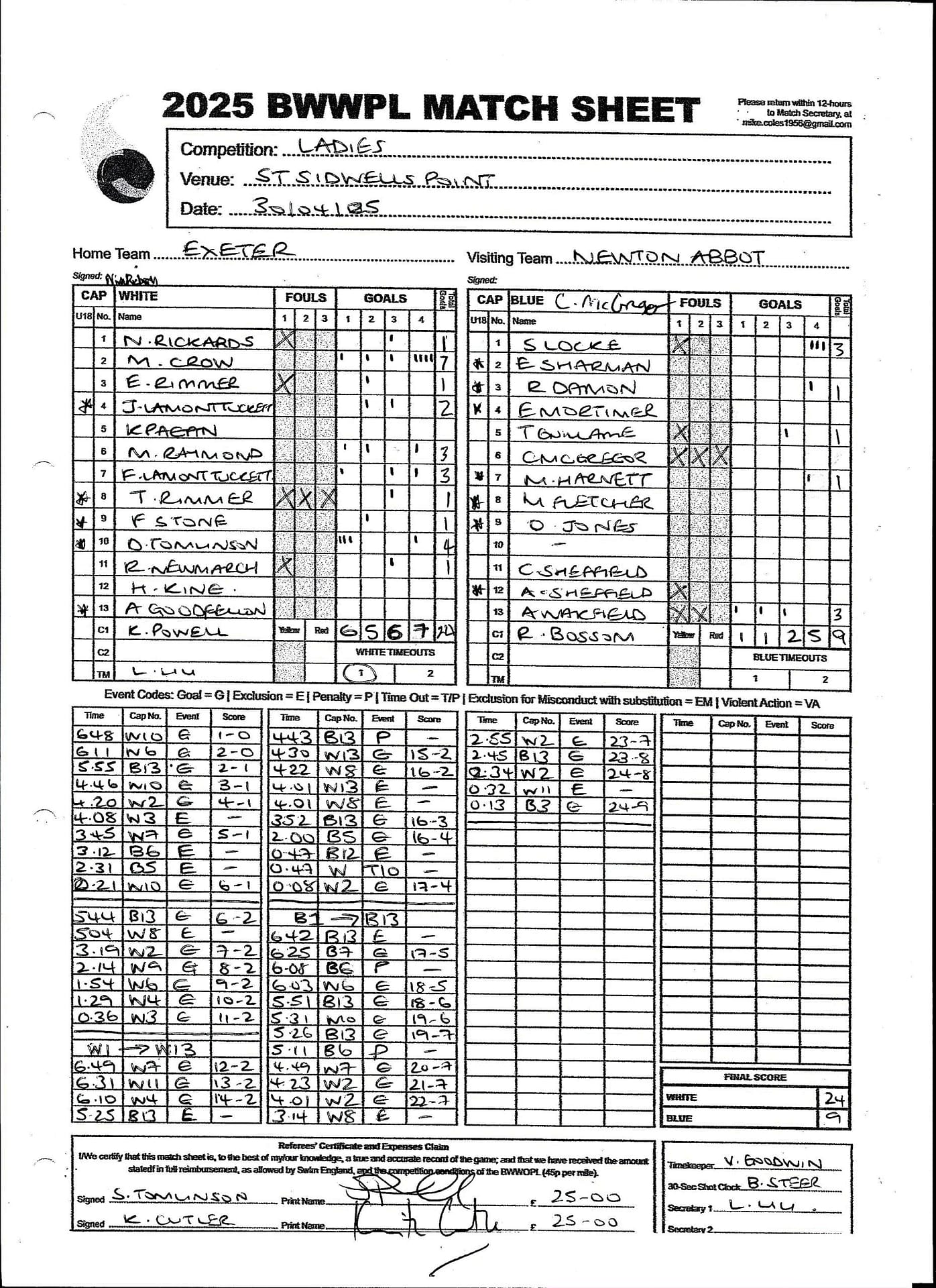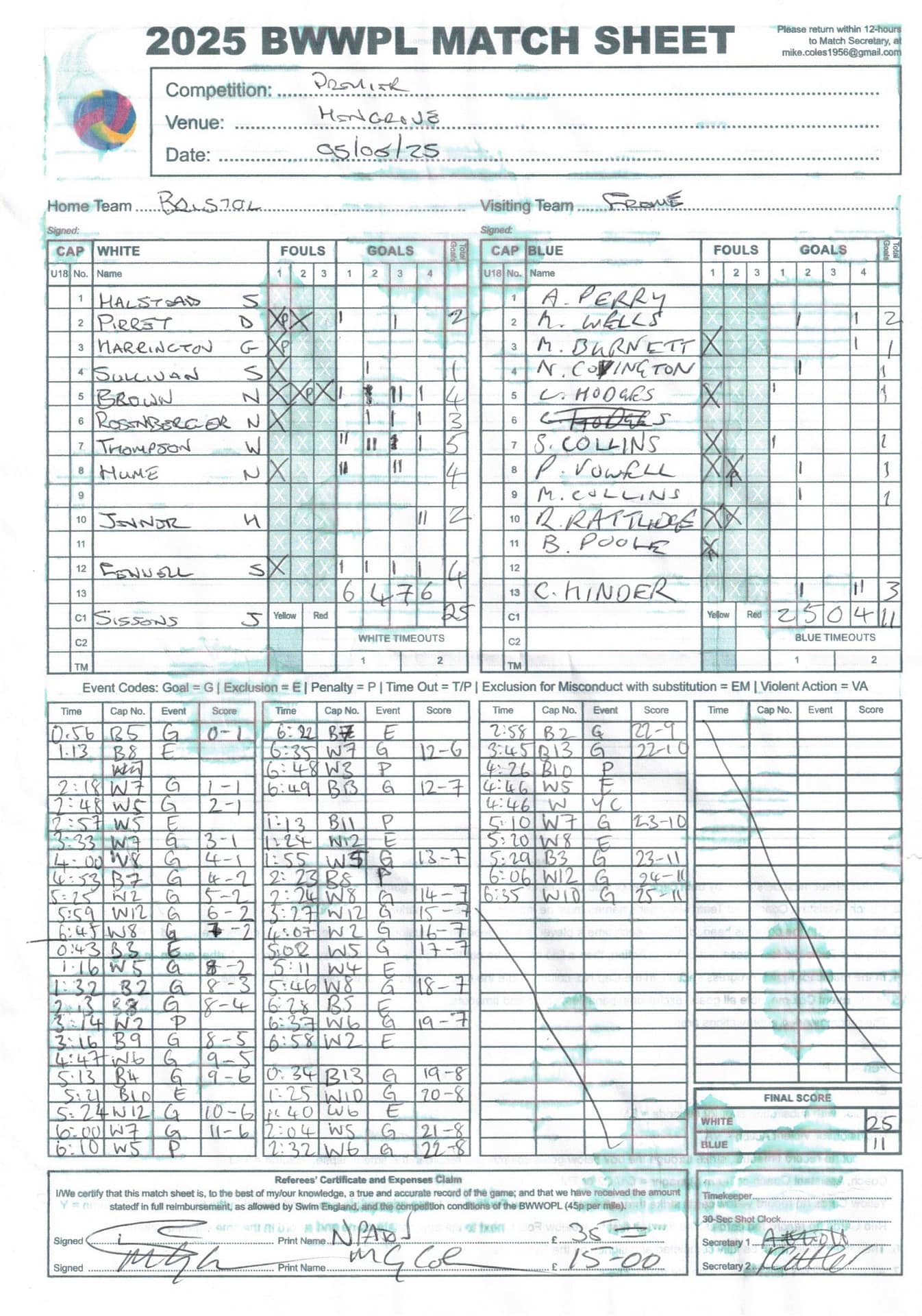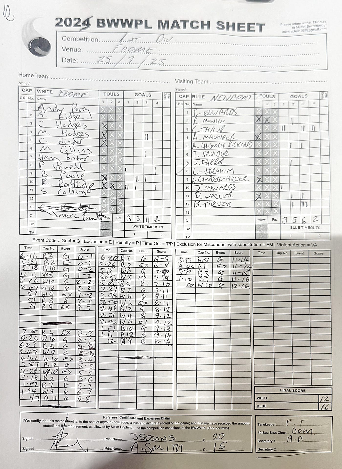 | Date | Home | Away | Time/Score | Pool | Division/Refs/Sheet | Mon, 24 Feb 25 | Bradford on Avon | Swansea | 11-8 | Bradford on Avon Swimming Pool | Match Sheet | Mon, 3 Mar 25 | Bradford on Avon | Swindon Dolphin | 12-12 | Bradford on Avon Swimming Pool | Match Sheet | Wed, 5 Mar 25 | Exeter Women | Welsh Wanderers Women | 14-8 | St Sidwell’s Point Leisure Centre, Exeter | Match Sheet | Wed, 5 Mar 25 | City of Newport | Welsh Wanderers | 8-30 | Newport International Pool | Match Sheet | Thr, 6 Mar 25 | City of Bristol | City of Bristol Barbarians | 18-9 | Hengrove Leisure Centre | Match Sheet | Tue, 11 Mar 25 | Devonport Royal Woman | Newton Abbot Women | 11-11 | Plymouth Life Centre | Match Sheet | Thr, 13 Mar 25 | City of Bristol Barbarians | City of Bristol | 11-12 | Hengrove Leisure Centre | Match Sheet | Tue, 18 Mar 25 | City of Bristol Women | City of Newport Women | 30-2 | Hengrove Leisure Centre | Match Sheet | Thr, 20 Mar 25 | City of Bristol Harlequins | Bradford on Avon | 12-5 | Hengrove Leisure Centre | Match Sheet | Sun, 23 Mar 25 | Swindon Dolphin | Bradford on Avon | 11-10 | Marlborough College Swimming Pool | Match Sheet | Sun, 23 Mar 25 | Weston-super-Mare | Newton Abbot | 10-8 | Hutton Moor Leisure Centre | Match Sheet | Mon, 24 Mar 25 | Bradford on Avon | City of Newport II | 5-0 | Bradford on Avon Swimming Pool | Cancelled by City of Newport II | Tue, 25 Mar 25 | Swansea | City of Bristol | 43 (32) - 25 | Wales National Pool, Swansea | Match Sheet | Tue, 25 Mar 25 | City of Bristol Women | Welsh Wanderers Women | 12-3 | Hengrove Leisure Centre | Match Sheet | Thr, 27 Mar 25 | City of Bristol Barbarians | Welsh Wanderers | 9-17 | Hengrove Leisure Centre | Match Sheet | Thr, 27 Mar 25 | Exeter Women | City of Newport Women | 5-0 | St Sidwell’s Point Leisure Centre, Exeter | Cancelled by City of Newport | Tue, 1 Apr 25 | Welsh Wanderers Women | Exeter Women | 12-19 | Cardiff International Pool | Match Sheet | Wed, 2 Apr 25 | City of Newport | City of Bristol | 10-14 | Newport International Pool | Match Sheet | Thr, 3 Apr 25 | City of Bristol Harlequins | Swansea | 10-9 | Hengrove Leisure Centre | Match Sheet | Sun, 6 Apr 25 | Weston-super-Mare | Welsh Wanderers II | 16-11 | Hutton Moor Leisure Centre | Match Sheet | Tue, 8 Apr 25 | Exeter | Devonport Royal | 21-12 | St Sidwell’s Point Leisure Centre, Exeter | Match Sheet | Sat, 12 Apr 25 | City of Newport II | Swindon Dolphin | 13-15 | Newport International Pool | Match Sheet | Thr, 17 Apr 25 | Welsh Wanderers II | Devonport Royal | 20-19 | Cardiff International Pool | Match Sheet | Tue, 22 Apr 25 | Devonport Royal Woman | Exeter Women | 7-19 | Plymouth Life Centre | Match Sheet | Wed, 23 Apr 25 | City of Newport | City of Bristol Barbarians | 13-11 | Newport International Pool | Match Sheet | Thr, 24 Apr 25 | City of Bristol Women | Newton Abbot Women | 33-6 | Hengrove Leisure Centre | Match Sheet | Sat, 26 Apr 25 | Devonport Royal Woman | Welsh Wanderers Women | 5-27 | Plymouth Life Centre | Match Sheet | Sun, 27 Apr 25 | Swindon Dolphin | Bradford on Avon | 12-14 | Marlborough College Swimming Pool | Match Sheet | Wed, 30 Apr 25 | Exeter Women | Newton Abbot Women | 24-9 | St Sidwell’s Point Leisure Centre, Exeter | Match Sheet | Thr, 1 May 25 | Welsh Wanderers II | Exeter | 17-21 | Cardiff International Pool | Match Sheet | Thr, 1 May 25 | City of Bristol Harlequins | City of Newport II | 14-12 | Hengrove Leisure Centre | Match Sheet | Thr, 8 May 25 | Welsh Wanderers II | Weston-super-Mare | 15-10 | Cardiff International Pool | Match Sheet | Thr, 8 May 25 | Frome | City of Bristol | 12-17 | Frome Sports and Fitness Centre | Match Sheet | Sat, 10 May 25 | Devonport Royal Woman | City of Newport Women | 5-0 | Plymouth Life Centre | Match cancelled by City of Newport | Tue, 13 May 25 | Swansea | City of Newport II | 12-10 | Wales National Pool, Swansea | Match Sheet | Tue, 13 May 25 | Exeter | Frome | 22 - 20 (6) | St Sidwell’s Point Leisure Centre, Exeter | Match Sheet | Thr, 15 May 25 | City of Bristol Barbarians | City of Newport | 15-8 | Hengrove Leisure Centre | Match Sheet | Sun, 18 May 25 | Swindon Dolphin | Swansea | 6-17 | Marlborough College Swimming Pool | Match Sheet | Sun, 18 May 25 | Weston-super-Mare | Devonport Royal | 6-14 | Hutton Moor Leisure Centre | Match Sheet | Tue, 20 May 25 | Exeter | Newton Abbot | 14-1 | St Sidwell’s Point Leisure Centre, Exeter | Match Sheet | Thr, 22 May 25 | Frome | City of Bristol Barbarians | 11-13 | Frome Sports and Fitness Centre | Match Sheet | Sun, 1 Jun 25 | Weston-super-Mare | Exeter | 12-12 | Hutton Moor Leisure Centre | Match Sheet | Thr, 5 Jun 25 | City of Bristol | Frome | 25-11 | Hengrove Leisure Centre | Match Sheet | Tue, 10 Jun 25 | Welsh Wanderers Women | City of Newport Women | 5-0 | Cardiff International Pool | Cancelled by City of Newport | Thr, 12 Jun 25 | City of Bristol Harlequins | Swindon Dolphin | 10-9 | Hengrove Leisure Centre | Match Sheet | Mon, 16 Jun 25 | Welsh Wanderers II | Newton Abbot | 25-11 | Cardiff International Pool | Match Sheet | Tue, 17 Jun 25 | Devonport Royal | Welsh Wanderers II | 16-14 | Plymouth Life Centre | Match Sheet | Thr, 19 Jun 25 | City of Bristol Barbarians | Frome | 19-13 | Hengrove Leisure Centre | Match Sheet | Sat, 21 Jun 25 | City of Newport II | Swansea | 3-10 | Newport International Pool | Match Sheet | Sun, 22 Jun 25 | Swindon Dolphin | City of Bristol Harlequins | 12-4 | Marlborough College Swimming Pool | Match Sheet | Sun, 22 Jun 25 | Newton Abbot Women | Welsh Wanderers Women | 8-17 | Kingsteignton Swimming Pool | Match Sheet | Sun, 22 Jun 25 | Newton Abbot | Exeter | 9-16 | Kingsteignton Swimming Pool | Match Sheet | Sun, 29 Jun 25 | Swindon Dolphin | City of Newport II | 11-10 | Marlborough College Swimming Pool | Match Sheet | Sun, 29 Jun 25 | Newton Abbot | Welsh Wanderers II | 16-10 | Kingsteignton Swimming Pool | Match Sheet | Sun, 29 Jun 25 | Weston-super-Mare | City of Newport | 14 (