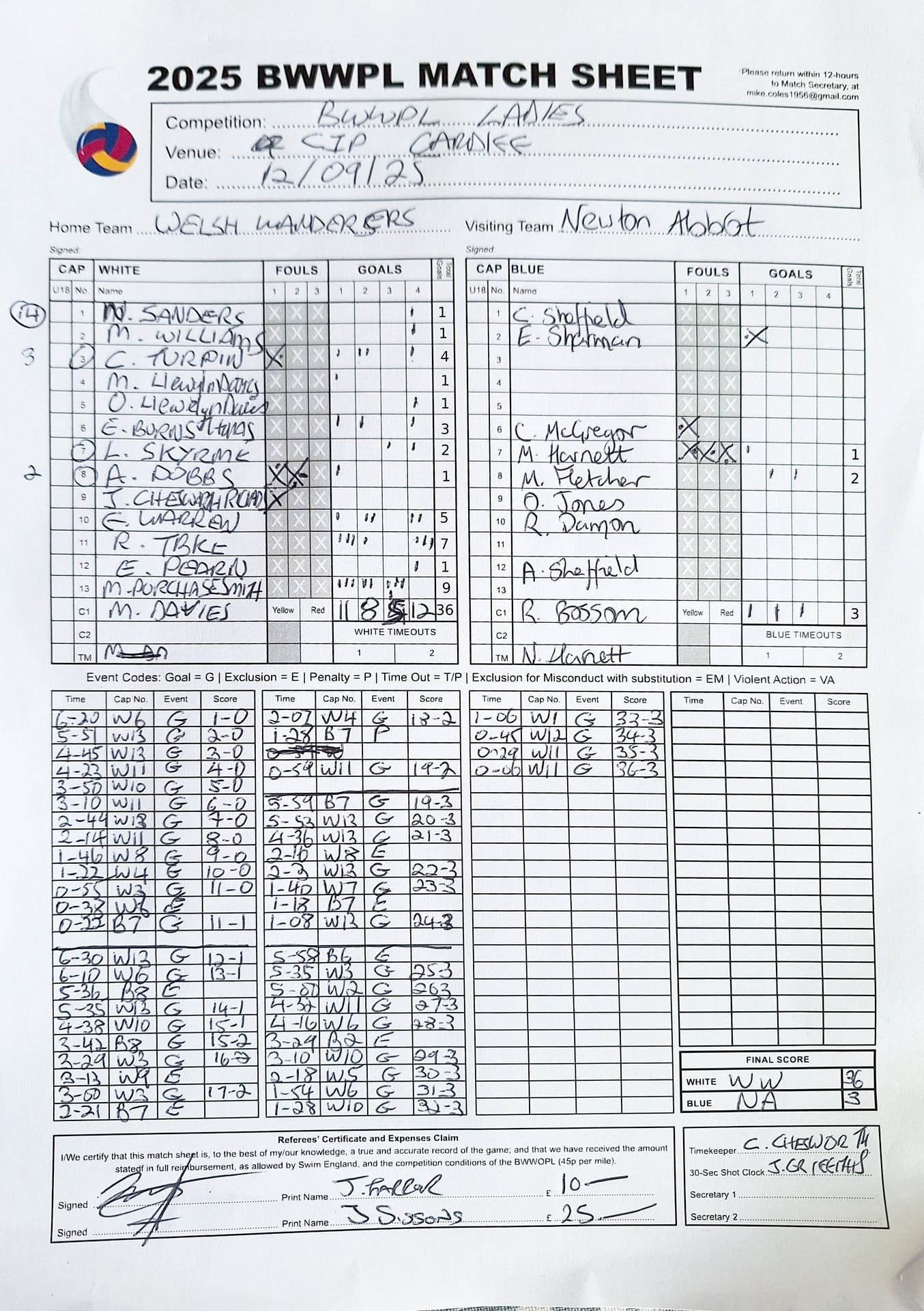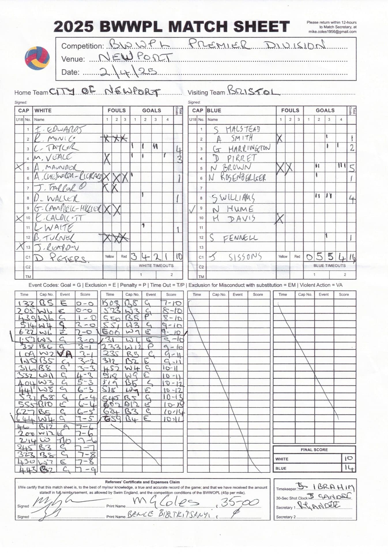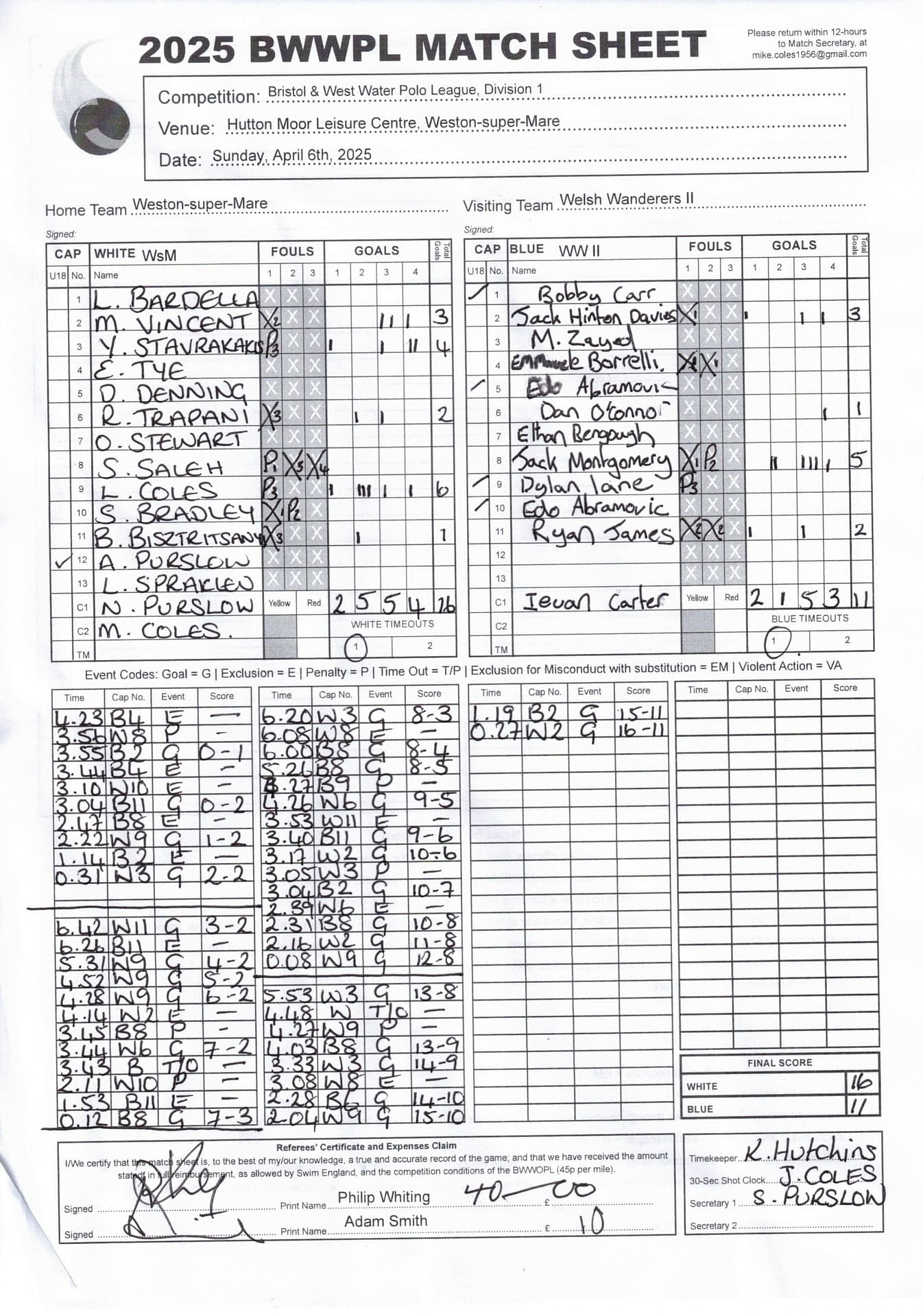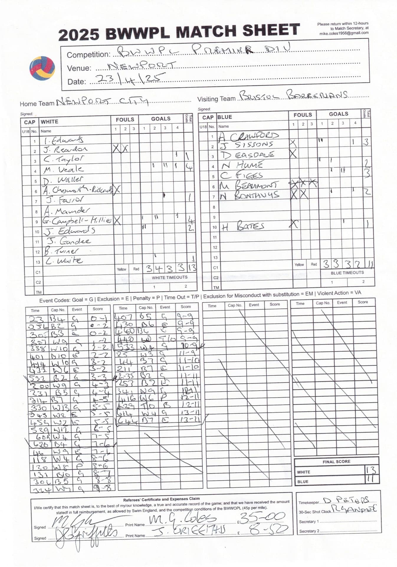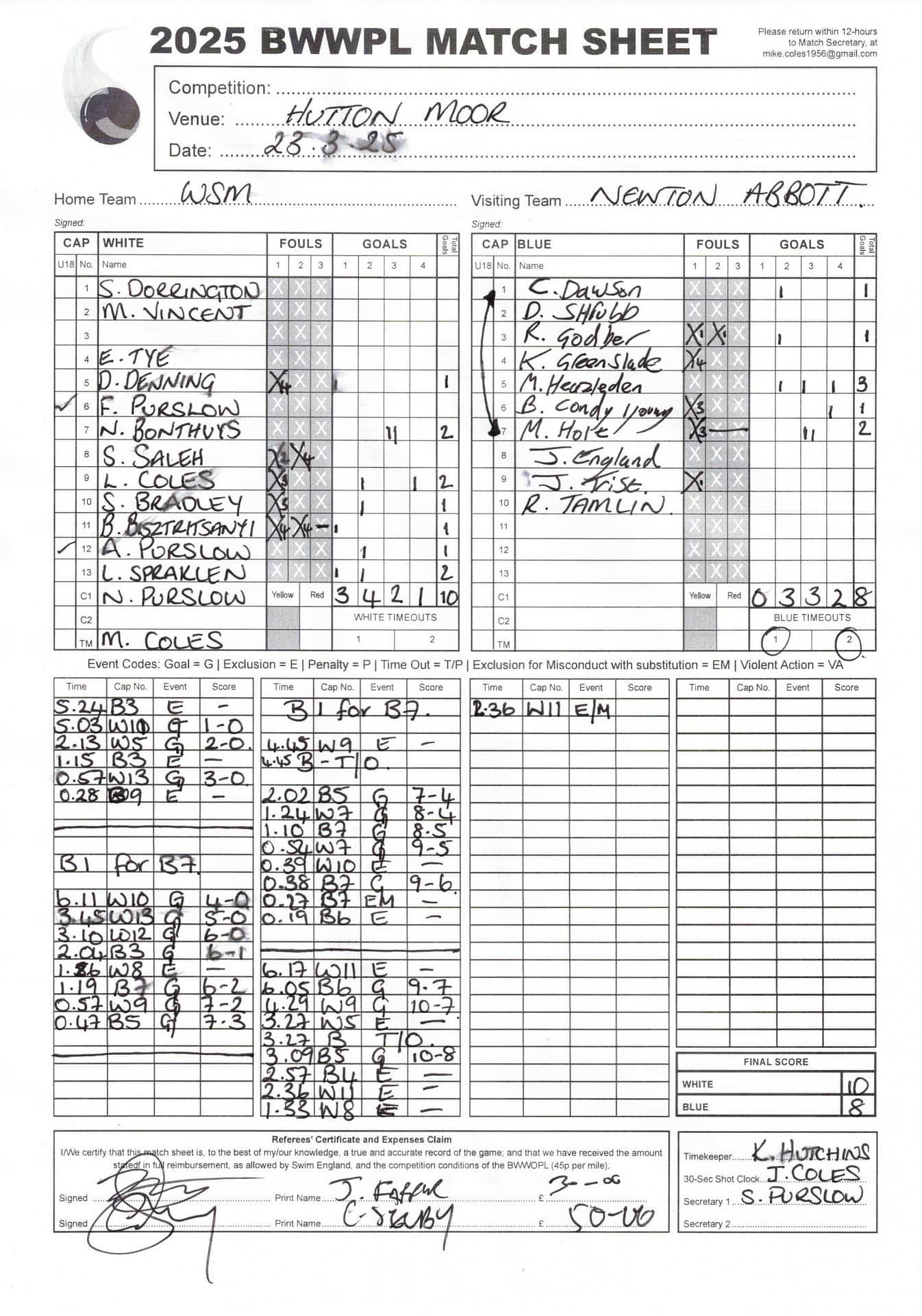 | Date | Home | Away | Time/Score | Pool | Division/Refs/Sheet | Mon, 24 Feb 25 | Bradford on Avon | Swansea | 11-8 | Bradford on Avon Swimming Pool | Match Sheet | Mon, 3 Mar 25 | Bradford on Avon | Swindon Dolphin | 12-12 | Bradford on Avon Swimming Pool | Match Sheet | Wed, 5 Mar 25 | Exeter Women | Welsh Wanderers Women | 14-8 | St Sidwell’s Point Leisure Centre, Exeter | Match Sheet | Wed, 5 Mar 25 | City of Newport | Welsh Wanderers | 8-30 | Newport International Pool | Match Sheet | Thr, 6 Mar 25 | City of Bristol | City of Bristol Barbarians | 18-9 | Hengrove Leisure Centre | Match Sheet | Tue, 11 Mar 25 | Devonport Royal Woman | Newton Abbot Women | 11-11 | Plymouth Life Centre | Match Sheet | Thr, 13 Mar 25 | City of Bristol Barbarians | City of Bristol | 11-12 | Hengrove Leisure Centre | Match Sheet | Tue, 18 Mar 25 | City of Bristol Women | City of Newport Women | 30-2 | Hengrove Leisure Centre | Match Sheet | Thr, 20 Mar 25 | City of Bristol Harlequins | Bradford on Avon | 12-5 | Hengrove Leisure Centre | Match Sheet | Sun, 23 Mar 25 | Swindon Dolphin | Bradford on Avon | 11-10 | Marlborough College Swimming Pool | Match Sheet | Sun, 23 Mar 25 | Weston-super-Mare | Newton Abbot | 10-8 | Hutton Moor Leisure Centre | Match Sheet | Mon, 24 Mar 25 | Bradford on Avon | City of Newport II | 5-0 | Bradford on Avon Swimming Pool | Cancelled by City of Newport II | Tue, 25 Mar 25 | Swansea | City of Bristol | 43 (32) - 25 | Wales National Pool, Swansea | Match Sheet | Tue, 25 Mar 25 | City of Bristol Women | Welsh Wanderers Women | 12-3 | Hengrove Leisure Centre | Match Sheet | Thr, 27 Mar 25 | City of Bristol Barbarians | Welsh Wanderers | 9-17 | Hengrove Leisure Centre | Match Sheet | Thr, 27 Mar 25 | Exeter Women | City of Newport Women | 5-0 | St Sidwell’s Point Leisure Centre, Exeter | Cancelled by City of Newport | Tue, 1 Apr 25 | Welsh Wanderers Women | Exeter Women | 12-19 | Cardiff International Pool | Match Sheet | Wed, 2 Apr 25 | City of Newport | City of Bristol | 10-14 | Newport International Pool | Match Sheet | Thr, 3 Apr 25 | City of Bristol Harlequins | Swansea | 10-9 | Hengrove Leisure Centre | Match Sheet | Sun, 6 Apr 25 | Weston-super-Mare | Welsh Wanderers II | 16-11 | Hutton Moor Leisure Centre | Match Sheet | Tue, 8 Apr 25 | Exeter | Devonport Royal | 21-12 | St Sidwell’s Point Leisure Centre, Exeter | Match Sheet | Sat, 12 Apr 25 | City of Newport II | Swindon Dolphin | 13-15 | Newport International Pool | Match Sheet | Thr, 17 Apr 25 | Welsh Wanderers II | Devonport Royal | 20-19 | Cardiff International Pool | Match Sheet | Tue, 22 Apr 25 | Devonport Royal Woman | Exeter Women | 7-19 | Plymouth Life Centre | Match Sheet | Wed, 23 Apr 25 | City of Newport | City of Bristol Barbarians | 13-11 | Newport International Pool | Match Sheet | Thr, 24 Apr 25 | City of Bristol Women | Newton Abbot Women | 33-6 | Hengrove Leisure Centre | Match Sheet | Sat, 26 Apr 25 | Devonport Royal Woman | Welsh Wanderers Women | 5-27 | Plymouth Life Centre | Match Sheet | Sun, 27 Apr 25 | Swindon Dolphin | Bradford on Avon | 12-14 | Marlborough College Swimming Pool | Match Sheet | Wed, 30 Apr 25 | Exeter Women | Newton Abbot Women | 24-9 | St Sidwell’s Point Leisure Centre, Exeter | Match Sheet | Thr, 1 May 25 | Welsh Wanderers II | Exeter | 17-21 | Cardiff International Pool | Match Sheet | Thr, 1 May 25 | City of Bristol Harlequins | City of Newport II | 14-12 | Hengrove Leisure Centre | Match Sheet | Thr, 8 May 25 | Welsh Wanderers II | Weston-super-Mare | 15-10 | Cardiff International Pool | Match Sheet | Thr, 8 May 25 | Frome | City of Bristol | 12-17 | Frome Sports and Fitness Centre | Match Sheet | Sat, 10 May 25 | Devonport Royal Woman | City of Newport Women | 5-0 | Plymouth Life Centre | Match cancelled by City of Newport | Tue, 13 May 25 | Swansea | City of Newport II | 12-10 | Wales National Pool, Swansea | Match Sheet | Tue, 13 May 25 | Exeter | Frome | 22 - 20 (6) | St Sidwell’s Point Leisure Centre, Exeter | Match Sheet | Thr, 15 May 25 | City of Bristol Barbarians | City of Newport | 15-8 | Hengrove Leisure Centre | Match Sheet | Sun, 18 May 25 | Swindon Dolphin | Swansea | 6-17 | Marlborough College Swimming Pool | Match Sheet | Sun, 18 May 25 | Weston-super-Mare | Devonport Royal | 6-14 | Hutton Moor Leisure Centre | Match Sheet | Tue, 20 May 25 | Exeter | Newton Abbot | 14-1 | St Sidwell’s Point Leisure Centre, Exeter | Match Sheet | Thr, 22 May 25 | Frome | City of Bristol Barbarians | 11-13 | Frome Sports and Fitness Centre | Match Sheet | Sun, 1 Jun 25 | Weston-super-Mare | Exeter | 12-12 | Hutton Moor Leisure Centre | Match Sheet | Thr, 5 Jun 25 | City of Bristol | Frome | 25-11 | Hengrove Leisure Centre | Match Sheet | Tue, 10 Jun 25 | Welsh Wanderers Women | City of Newport Women | 5-0 | Cardiff International Pool | Cancelled by City of Newport | Thr, 12 Jun 25 | City of Bristol Harlequins | Swindon Dolphin | 10-9 | Hengrove Leisure Centre | Match Sheet | Mon, 16 Jun 25 | Welsh Wanderers II | Newton Abbot | 25-11 | Cardiff International Pool | Match Sheet | Tue, 17 Jun 25 | Devonport Royal | Welsh Wanderers II | 16-14 | Plymouth Life Centre | Match Sheet | Thr, 19 Jun 25 | City of Bristol Barbarians | Frome | 19-13 | Hengrove Leisure Centre | Match Sheet | Sat, 21 Jun 25 | City of Newport II | Swansea | 3-10 | Newport International Pool | Match Sheet | Sun, 22 Jun 25 | Swindon Dolphin | City of Bristol Harlequins | 12-4 | Marlborough College Swimming Pool | Match Sheet | Sun, 22 Jun 25 | Newton Abbot Women | Welsh Wanderers Women | 8-17 | Kingsteignton Swimming Pool | Match Sheet | Sun, 22 Jun 25 | Newton Abbot | Exeter | 9-16 | Kingsteignton Swimming Pool | Match Sheet | Sun, 29 Jun 25 | Swindon Dolphin | City of Newport II | 11-10 | Marlborough College Swimming Pool | Match Sheet | Sun, 29 Jun 25 | Newton Abbot | Welsh Wanderers II | 16-10 | Kingsteignton Swimming Pool | Match Sheet | Sun, 29 Jun 25 | Weston-super-Mare | City of Newport | 14 (