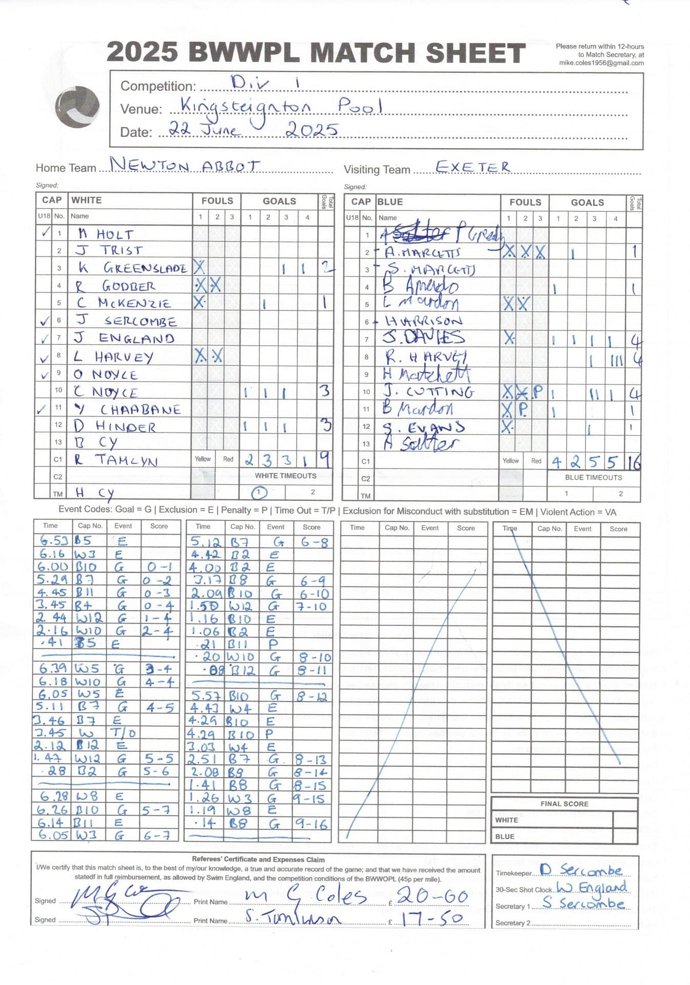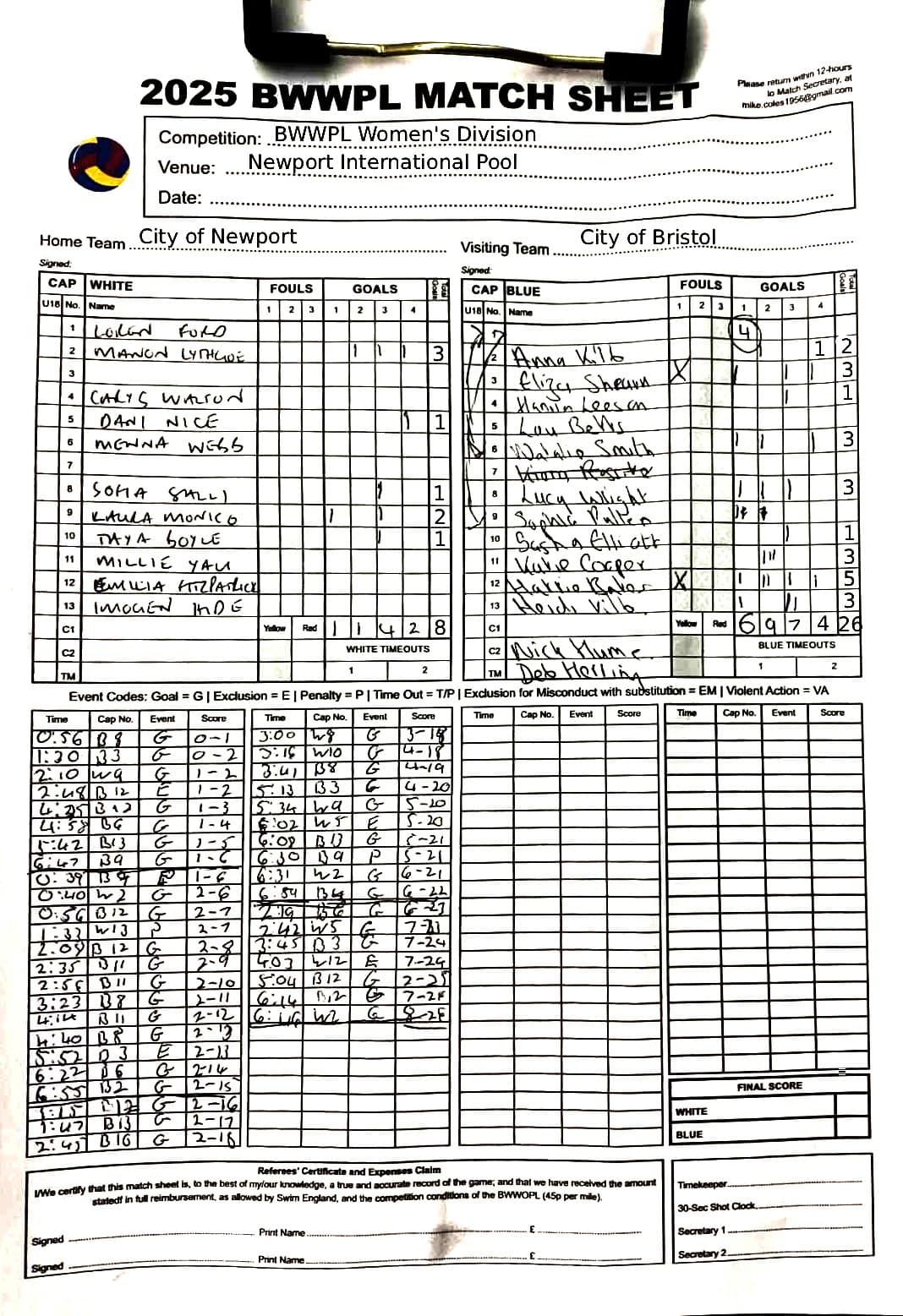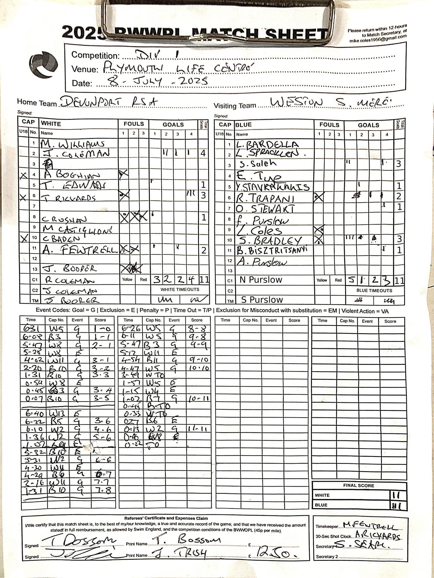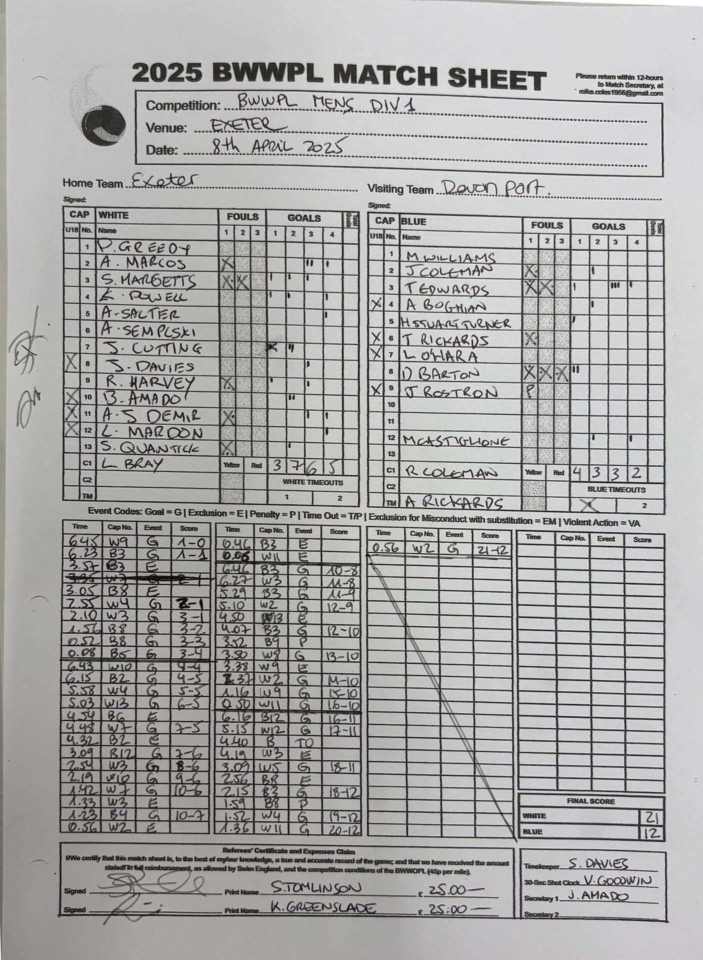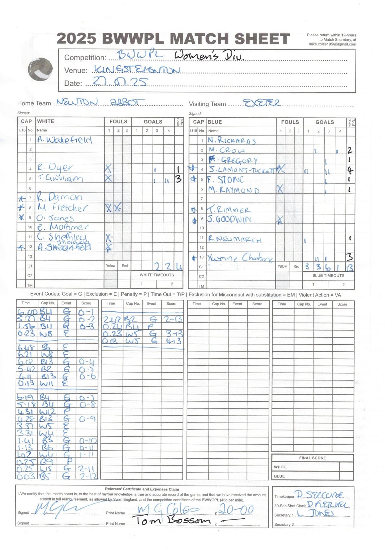 | Date | Home | Away | Time/Score | Pool | Division/Refs/Sheet | Mon, 24 Feb 25 | Bradford on Avon | Swansea | 11-8 | Bradford on Avon Swimming Pool | Match Sheet | Mon, 3 Mar 25 | Bradford on Avon | Swindon Dolphin | 12-12 | Bradford on Avon Swimming Pool | Match Sheet | Wed, 5 Mar 25 | Exeter Women | Welsh Wanderers Women | 14-8 | St Sidwell’s Point Leisure Centre, Exeter | Match Sheet | Wed, 5 Mar 25 | City of Newport | Welsh Wanderers | 8-30 | Newport International Pool | Match Sheet | Thr, 6 Mar 25 | City of Bristol | City of Bristol Barbarians | 18-9 | Hengrove Leisure Centre | Match Sheet | Tue, 11 Mar 25 | Devonport Royal Woman | Newton Abbot Women | 11-11 | Plymouth Life Centre | Match Sheet | Thr, 13 Mar 25 | City of Bristol Barbarians | City of Bristol | 11-12 | Hengrove Leisure Centre | Match Sheet | Tue, 18 Mar 25 | City of Bristol Women | City of Newport Women | 30-2 | Hengrove Leisure Centre | Match Sheet | Thr, 20 Mar 25 | City of Bristol Harlequins | Bradford on Avon | 12-5 | Hengrove Leisure Centre | Match Sheet | Sun, 23 Mar 25 | Swindon Dolphin | Bradford on Avon | 11-10 | Marlborough College Swimming Pool | Match Sheet | Sun, 23 Mar 25 | Weston-super-Mare | Newton Abbot | 10-8 | Hutton Moor Leisure Centre | Match Sheet | Mon, 24 Mar 25 | Bradford on Avon | City of Newport II | 5-0 | Bradford on Avon Swimming Pool | Cancelled by City of Newport II | Tue, 25 Mar 25 | Swansea | City of Bristol | 43 (32) - 25 | Wales National Pool, Swansea | Match Sheet | Tue, 25 Mar 25 | City of Bristol Women | Welsh Wanderers Women | 12-3 | Hengrove Leisure Centre | Match Sheet | Thr, 27 Mar 25 | City of Bristol Barbarians | Welsh Wanderers | 9-17 | Hengrove Leisure Centre | Match Sheet | Thr, 27 Mar 25 | Exeter Women | City of Newport Women | 5-0 | St Sidwell’s Point Leisure Centre, Exeter | Cancelled by City of Newport | Tue, 1 Apr 25 | Welsh Wanderers Women | Exeter Women | 12-19 | Cardiff International Pool | Match Sheet | Wed, 2 Apr 25 | City of Newport | City of Bristol | 10-14 | Newport International Pool | Match Sheet | Thr, 3 Apr 25 | City of Bristol Harlequins | Swansea | 10-9 | Hengrove Leisure Centre | Match Sheet | Sun, 6 Apr 25 | Weston-super-Mare | Welsh Wanderers II | 16-11 | Hutton Moor Leisure Centre | Match Sheet | Tue, 8 Apr 25 | Exeter | Devonport Royal | 21-12 | St Sidwell’s Point Leisure Centre, Exeter | Match Sheet | Sat, 12 Apr 25 | City of Newport II | Swindon Dolphin | 13-15 | Newport International Pool | Match Sheet | Thr, 17 Apr 25 | Welsh Wanderers II | Devonport Royal | 20-19 | Cardiff International Pool | Match Sheet | Tue, 22 Apr 25 | Devonport Royal Woman | Exeter Women | 7-19 | Plymouth Life Centre | Match Sheet | Wed, 23 Apr 25 | City of Newport | City of Bristol Barbarians | 13-11 | Newport International Pool | Match Sheet | Thr, 24 Apr 25 | City of Bristol Women | Newton Abbot Women | 33-6 | Hengrove Leisure Centre | Match Sheet | Sat, 26 Apr 25 | Devonport Royal Woman | Welsh Wanderers Women | 5-27 | Plymouth Life Centre | Match Sheet | Sun, 27 Apr 25 | Swindon Dolphin | Bradford on Avon | 12-14 | Marlborough College Swimming Pool | Match Sheet | Wed, 30 Apr 25 | Exeter Women | Newton Abbot Women | 24-9 | St Sidwell’s Point Leisure Centre, Exeter | Match Sheet | Thr, 1 May 25 | Welsh Wanderers II | Exeter | 17-21 | Cardiff International Pool | Match Sheet | Thr, 1 May 25 | City of Bristol Harlequins | City of Newport II | 14-12 | Hengrove Leisure Centre | Match Sheet | Thr, 8 May 25 | Welsh Wanderers II | Weston-super-Mare | 15-10 | Cardiff International Pool | Match Sheet | Thr, 8 May 25 | Frome | City of Bristol | 12-17 | Frome Sports and Fitness Centre | Match Sheet | Sat, 10 May 25 | Devonport Royal Woman | City of Newport Women | 5-0 | Plymouth Life Centre | Match cancelled by City of Newport | Tue, 13 May 25 | Swansea | City of Newport II | 12-10 | Wales National Pool, Swansea | Match Sheet | Tue, 13 May 25 | Exeter | Frome | 22 - 20 (6) | St Sidwell’s Point Leisure Centre, Exeter | Match Sheet | Thr, 15 May 25 | City of Bristol Barbarians | City of Newport | 15-8 | Hengrove Leisure Centre | Match Sheet | Sun, 18 May 25 | Swindon Dolphin | Swansea | 6-17 | Marlborough College Swimming Pool | Match Sheet | Sun, 18 May 25 | Weston-super-Mare | Devonport Royal | 6-14 | Hutton Moor Leisure Centre | Match Sheet | Tue, 20 May 25 | Exeter | Newton Abbot | 14-1 | St Sidwell’s Point Leisure Centre, Exeter | Match Sheet | Thr, 22 May 25 | Frome | City of Bristol Barbarians | 11-13 | Frome Sports and Fitness Centre | Match Sheet | Sun, 1 Jun 25 | Weston-super-Mare | Exeter | 12-12 | Hutton Moor Leisure Centre | Match Sheet | Thr, 5 Jun 25 | City of Bristol | Frome | 25-11 | Hengrove Leisure Centre | Match Sheet | Tue, 10 Jun 25 | Welsh Wanderers Women | City of Newport Women | 5-0 | Cardiff International Pool | Cancelled by City of Newport | Thr, 12 Jun 25 | City of Bristol Harlequins | Swindon Dolphin | 10-9 | Hengrove Leisure Centre | Match Sheet | Mon, 16 Jun 25 | Welsh Wanderers II | Newton Abbot | 25-11 | Cardiff International Pool | Match Sheet | Tue, 17 Jun 25 | Devonport Royal | Welsh Wanderers II | 16-14 | Plymouth Life Centre | Match Sheet | Thr, 19 Jun 25 | City of Bristol Barbarians | Frome | 19-13 | Hengrove Leisure Centre | Match Sheet | Sat, 21 Jun 25 | City of Newport II | Swansea | 3-10 | Newport International Pool | Match Sheet | Sun, 22 Jun 25 | Swindon Dolphin | City of Bristol Harlequins | 12-4 | Marlborough College Swimming Pool | Match Sheet | Sun, 22 Jun 25 | Newton Abbot Women | Welsh Wanderers Women | 8-17 | Kingsteignton Swimming Pool | Match Sheet | Sun, 22 Jun 25 | Newton Abbot | Exeter | 9-16 | Kingsteignton Swimming Pool | Match Sheet | Sun, 29 Jun 25 | Swindon Dolphin | City of Newport II | 11-10 | Marlborough College Swimming Pool | Match Sheet | Sun, 29 Jun 25 | Newton Abbot | Welsh Wanderers II | 16-10 | Kingsteignton Swimming Pool | Match Sheet | Sun, 29 Jun 25 | Weston-super-Mare | City of Newport | 14 (