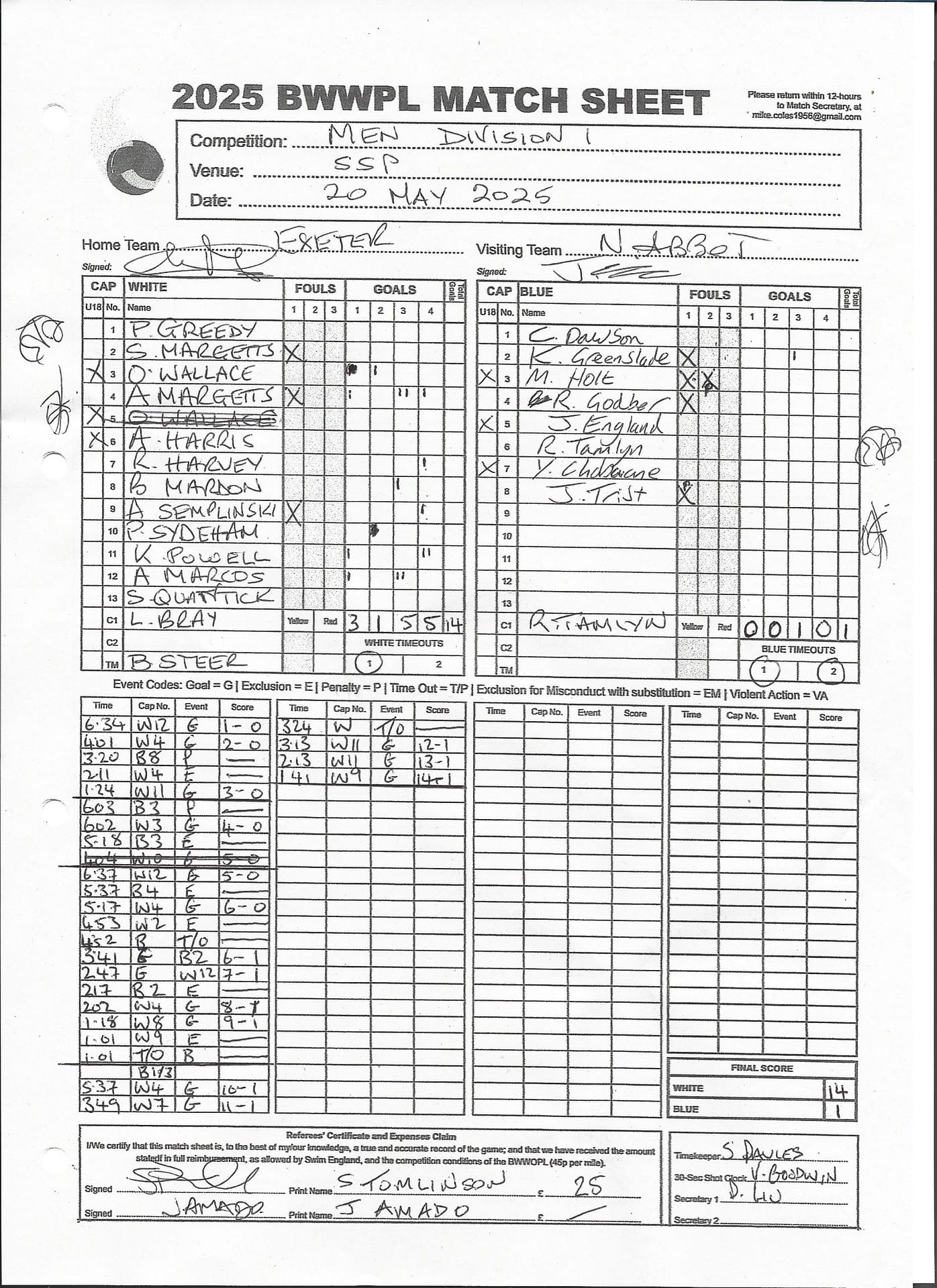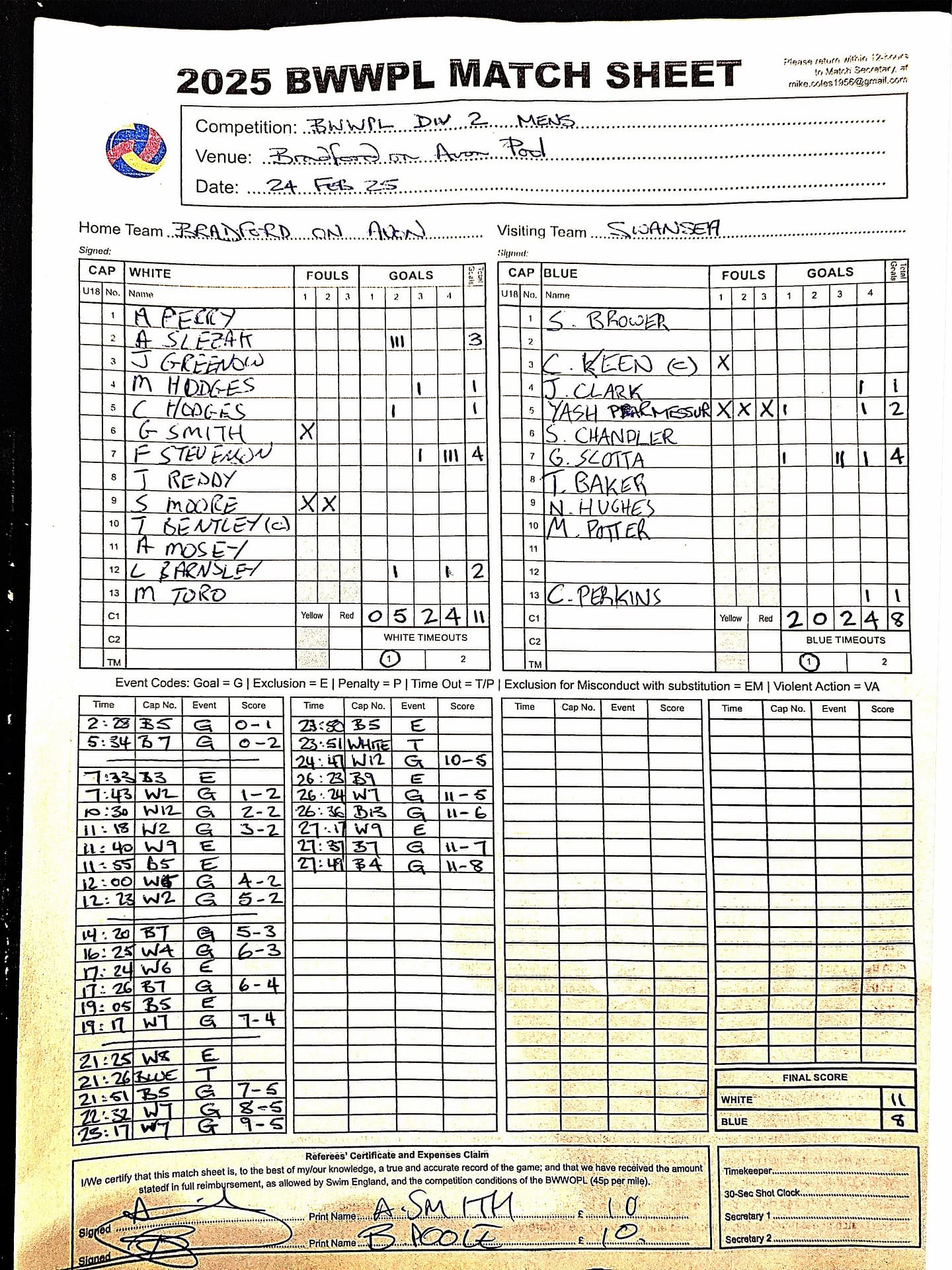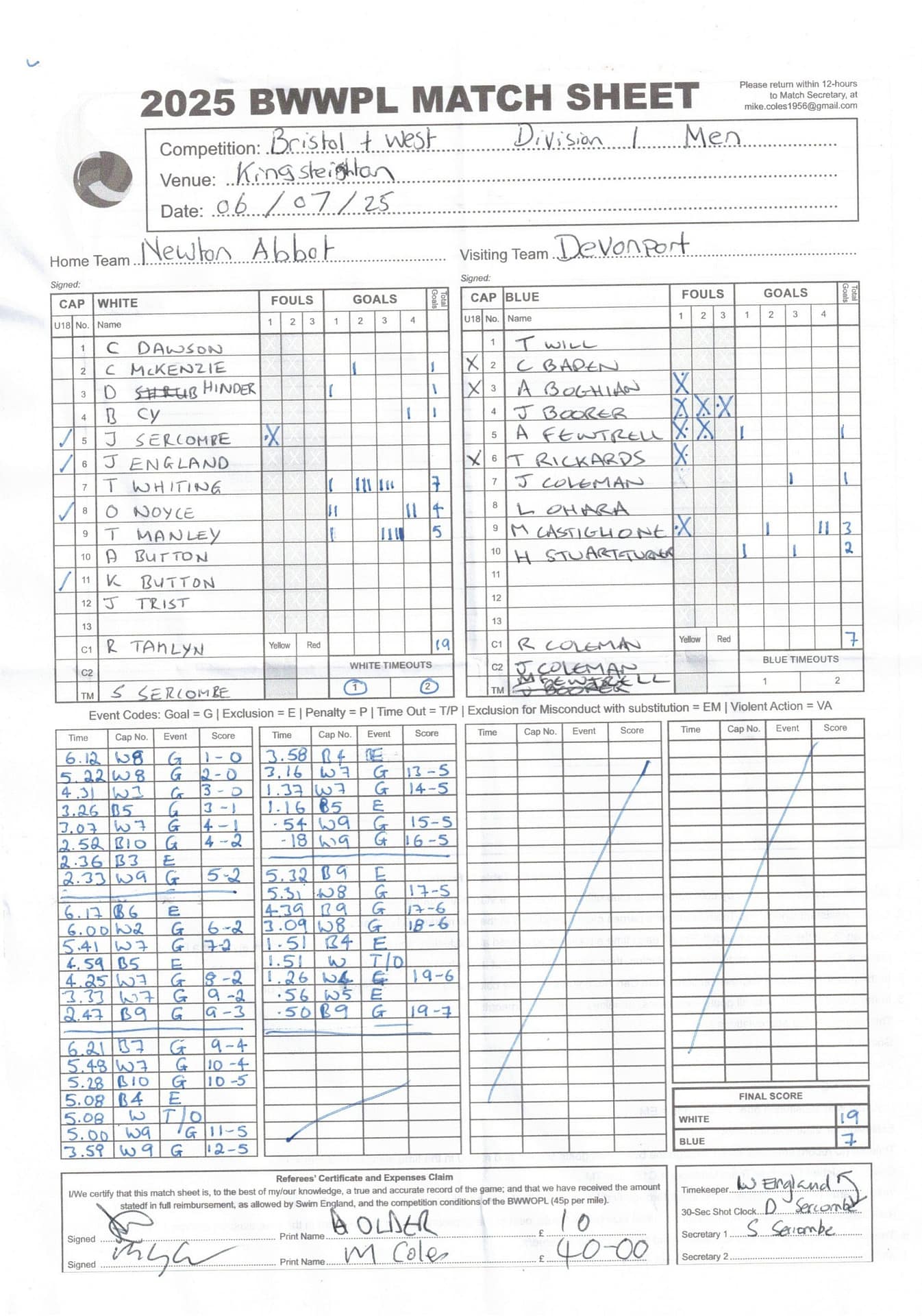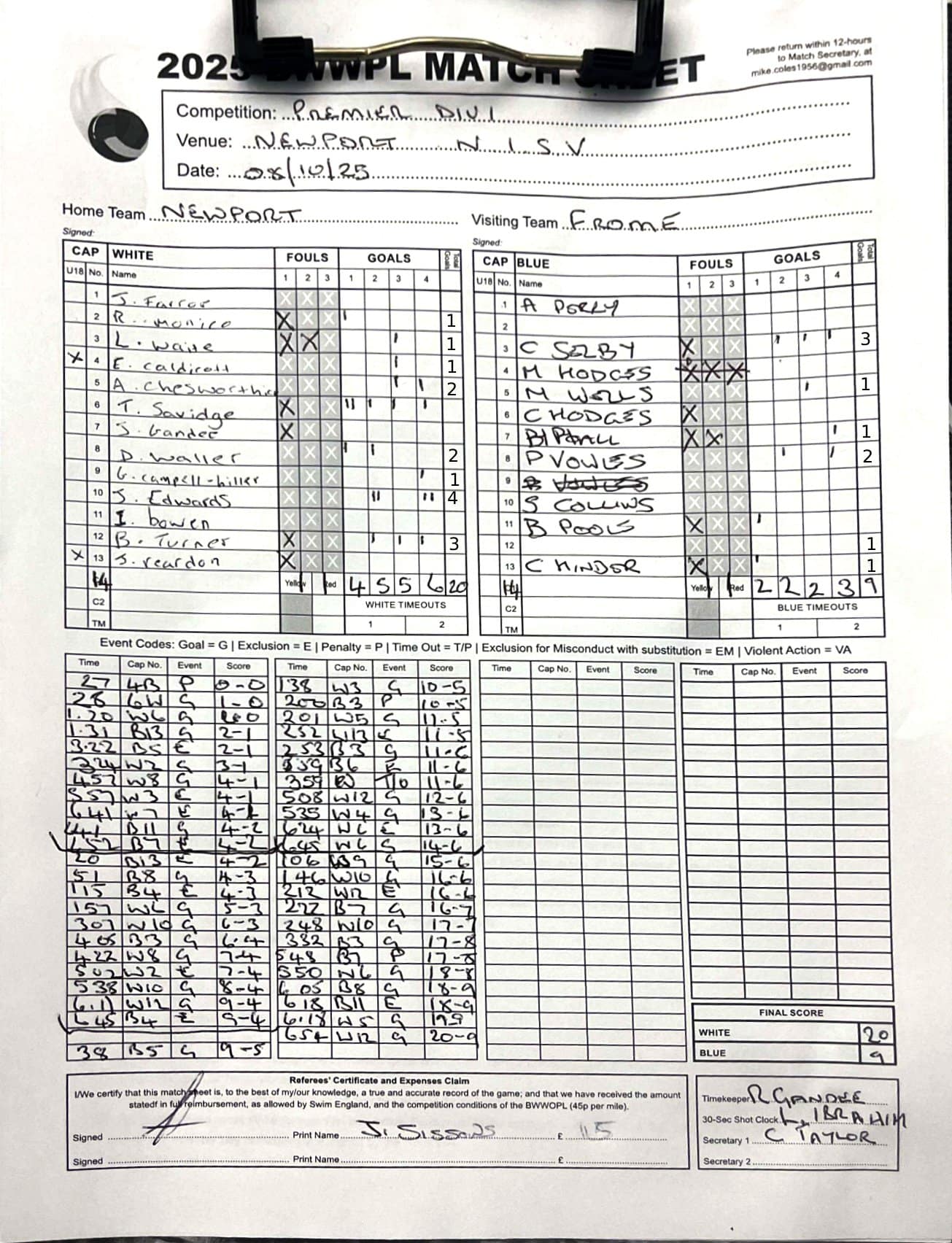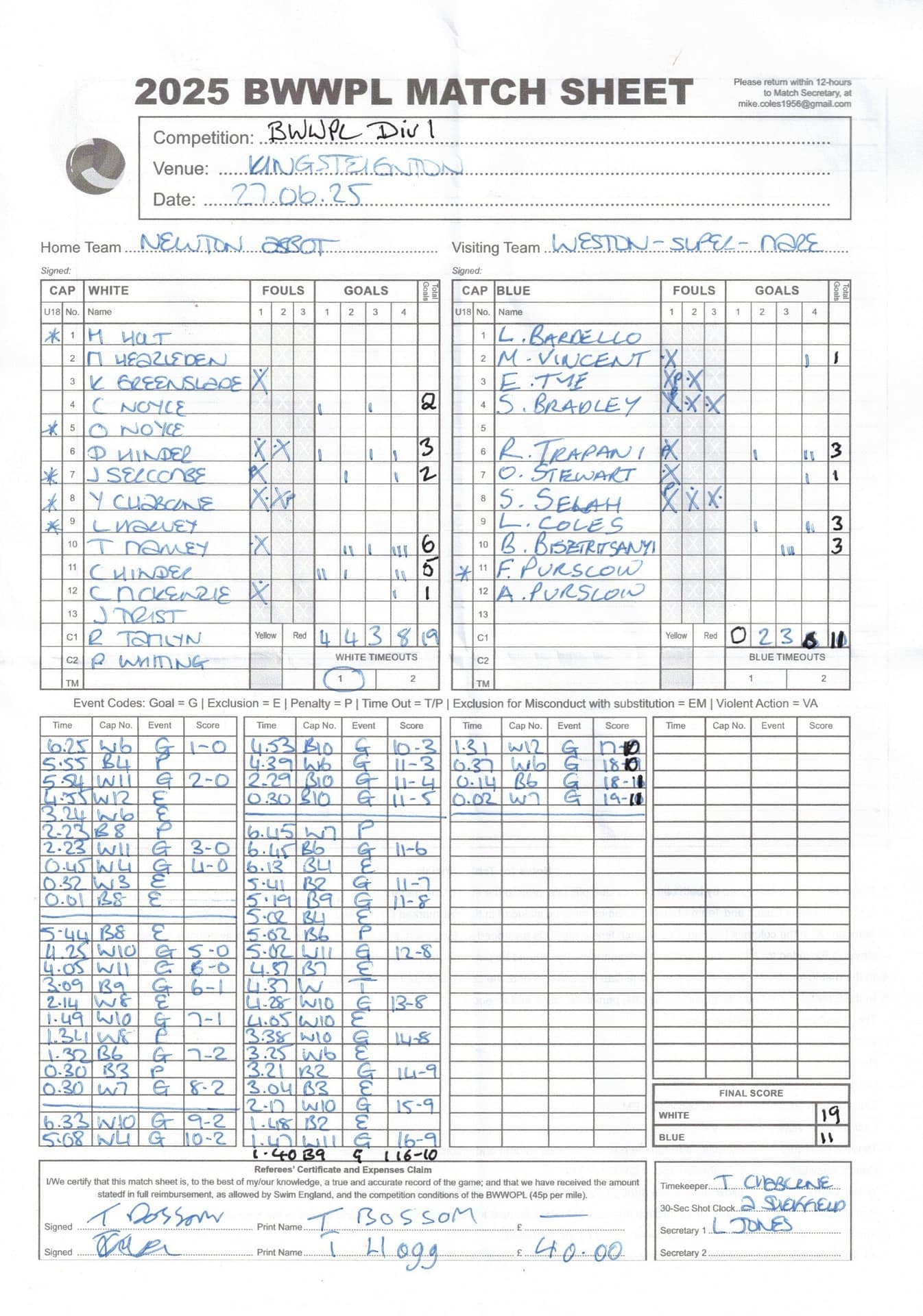 | Date | Home | Away | Time/Score | Pool | Division/Refs/Sheet | Mon, 24 Feb 25 | Bradford on Avon | Swansea | 11-8 | Bradford on Avon Swimming Pool | Match Sheet | Mon, 3 Mar 25 | Bradford on Avon | Swindon Dolphin | 12-12 | Bradford on Avon Swimming Pool | Match Sheet | Wed, 5 Mar 25 | Exeter Women | Welsh Wanderers Women | 14-8 | St Sidwell’s Point Leisure Centre, Exeter | Match Sheet | Wed, 5 Mar 25 | City of Newport | Welsh Wanderers | 8-30 | Newport International Pool | Match Sheet | Thr, 6 Mar 25 | City of Bristol | City of Bristol Barbarians | 18-9 | Hengrove Leisure Centre | Match Sheet | Tue, 11 Mar 25 | Devonport Royal Woman | Newton Abbot Women | 11-11 | Plymouth Life Centre | Match Sheet | Thr, 13 Mar 25 | City of Bristol Barbarians | City of Bristol | 11-12 | Hengrove Leisure Centre | Match Sheet | Tue, 18 Mar 25 | City of Bristol Women | City of Newport Women | 30-2 | Hengrove Leisure Centre | Match Sheet | Thr, 20 Mar 25 | City of Bristol Harlequins | Bradford on Avon | 12-5 | Hengrove Leisure Centre | Match Sheet | Sun, 23 Mar 25 | Swindon Dolphin | Bradford on Avon | 11-10 | Marlborough College Swimming Pool | Match Sheet | Sun, 23 Mar 25 | Weston-super-Mare | Newton Abbot | 10-8 | Hutton Moor Leisure Centre | Match Sheet | Mon, 24 Mar 25 | Bradford on Avon | City of Newport II | 5-0 | Bradford on Avon Swimming Pool | Cancelled by City of Newport II | Tue, 25 Mar 25 | Swansea | City of Bristol | 43 (32) - 25 | Wales National Pool, Swansea | Match Sheet | Tue, 25 Mar 25 | City of Bristol Women | Welsh Wanderers Women | 12-3 | Hengrove Leisure Centre | Match Sheet | Thr, 27 Mar 25 | City of Bristol Barbarians | Welsh Wanderers | 9-17 | Hengrove Leisure Centre | Match Sheet | Thr, 27 Mar 25 | Exeter Women | City of Newport Women | 5-0 | St Sidwell’s Point Leisure Centre, Exeter | Cancelled by City of Newport | Tue, 1 Apr 25 | Welsh Wanderers Women | Exeter Women | 12-19 | Cardiff International Pool | Match Sheet | Wed, 2 Apr 25 | City of Newport | City of Bristol | 10-14 | Newport International Pool | Match Sheet | Thr, 3 Apr 25 | City of Bristol Harlequins | Swansea | 10-9 | Hengrove Leisure Centre | Match Sheet | Sun, 6 Apr 25 | Weston-super-Mare | Welsh Wanderers II | 16-11 | Hutton Moor Leisure Centre | Match Sheet | Tue, 8 Apr 25 | Exeter | Devonport Royal | 21-12 | St Sidwell’s Point Leisure Centre, Exeter | Match Sheet | Sat, 12 Apr 25 | City of Newport II | Swindon Dolphin | 13-15 | Newport International Pool | Match Sheet | Thr, 17 Apr 25 | Welsh Wanderers II | Devonport Royal | 20-19 | Cardiff International Pool | Match Sheet | Tue, 22 Apr 25 | Devonport Royal Woman | Exeter Women | 7-19 | Plymouth Life Centre | Match Sheet | Wed, 23 Apr 25 | City of Newport | City of Bristol Barbarians | 13-11 | Newport International Pool | Match Sheet | Thr, 24 Apr 25 | City of Bristol Women | Newton Abbot Women | 33-6 | Hengrove Leisure Centre | Match Sheet | Sat, 26 Apr 25 | Devonport Royal Woman | Welsh Wanderers Women | 5-27 | Plymouth Life Centre | Match Sheet | Sun, 27 Apr 25 | Swindon Dolphin | Bradford on Avon | 12-14 | Marlborough College Swimming Pool | Match Sheet | Wed, 30 Apr 25 | Exeter Women | Newton Abbot Women | 24-9 | St Sidwell’s Point Leisure Centre, Exeter | Match Sheet | Thr, 1 May 25 | Welsh Wanderers II | Exeter | 17-21 | Cardiff International Pool | Match Sheet | Thr, 1 May 25 | City of Bristol Harlequins | City of Newport II | 14-12 | Hengrove Leisure Centre | Match Sheet | Thr, 8 May 25 | Welsh Wanderers II | Weston-super-Mare | 15-10 | Cardiff International Pool | Match Sheet | Thr, 8 May 25 | Frome | City of Bristol | 12-17 | Frome Sports and Fitness Centre | Match Sheet | Sat, 10 May 25 | Devonport Royal Woman | City of Newport Women | 5-0 | Plymouth Life Centre | Match cancelled by City of Newport | Tue, 13 May 25 | Swansea | City of Newport II | 12-10 | Wales National Pool, Swansea | Match Sheet | Tue, 13 May 25 | Exeter | Frome | 22 - 20 (6) | St Sidwell’s Point Leisure Centre, Exeter | Match Sheet | Thr, 15 May 25 | City of Bristol Barbarians | City of Newport | 15-8 | Hengrove Leisure Centre | Match Sheet | Sun, 18 May 25 | Swindon Dolphin | Swansea | 6-17 | Marlborough College Swimming Pool | Match Sheet | Sun, 18 May 25 | Weston-super-Mare | Devonport Royal | 6-14 | Hutton Moor Leisure Centre | Match Sheet | Tue, 20 May 25 | Exeter | Newton Abbot | 14-1 | St Sidwell’s Point Leisure Centre, Exeter | Match Sheet | Thr, 22 May 25 | Frome | City of Bristol Barbarians | 11-13 | Frome Sports and Fitness Centre | Match Sheet | Sun, 1 Jun 25 | Weston-super-Mare | Exeter | 12-12 | Hutton Moor Leisure Centre | Match Sheet | Thr, 5 Jun 25 | City of Bristol | Frome | 25-11 | Hengrove Leisure Centre | Match Sheet | Tue, 10 Jun 25 | Welsh Wanderers Women | City of Newport Women | 5-0 | Cardiff International Pool | Cancelled by City of Newport | Thr, 12 Jun 25 | City of Bristol Harlequins | Swindon Dolphin | 10-9 | Hengrove Leisure Centre | Match Sheet | Mon, 16 Jun 25 | Welsh Wanderers II | Newton Abbot | 25-11 | Cardiff International Pool | Match Sheet | Tue, 17 Jun 25 | Devonport Royal | Welsh Wanderers II | 16-14 | Plymouth Life Centre | Match Sheet | Thr, 19 Jun 25 | City of Bristol Barbarians | Frome | 19-13 | Hengrove Leisure Centre | Match Sheet | Sat, 21 Jun 25 | City of Newport II | Swansea | 3-10 | Newport International Pool | Match Sheet | Sun, 22 Jun 25 | Swindon Dolphin | City of Bristol Harlequins | 12-4 | Marlborough College Swimming Pool | Match Sheet | Sun, 22 Jun 25 | Newton Abbot Women | Welsh Wanderers Women | 8-17 | Kingsteignton Swimming Pool | Match Sheet | Sun, 22 Jun 25 | Newton Abbot | Exeter | 9-16 | Kingsteignton Swimming Pool | Match Sheet | Sun, 29 Jun 25 | Swindon Dolphin | City of Newport II | 11-10 | Marlborough College Swimming Pool | Match Sheet | Sun, 29 Jun 25 | Newton Abbot | Welsh Wanderers II | 16-10 | Kingsteignton Swimming Pool | Match Sheet | Sun, 29 Jun 25 | Weston-super-Mare | City of Newport | 14 (