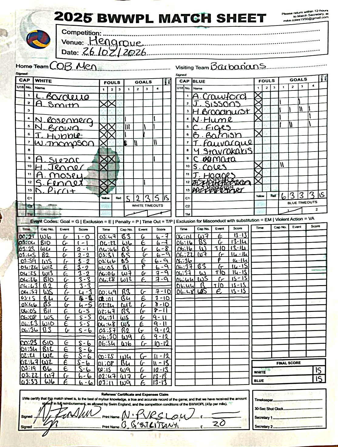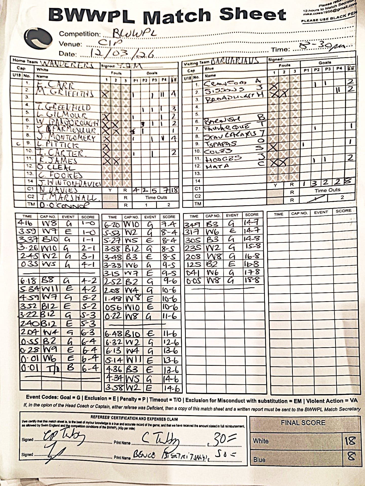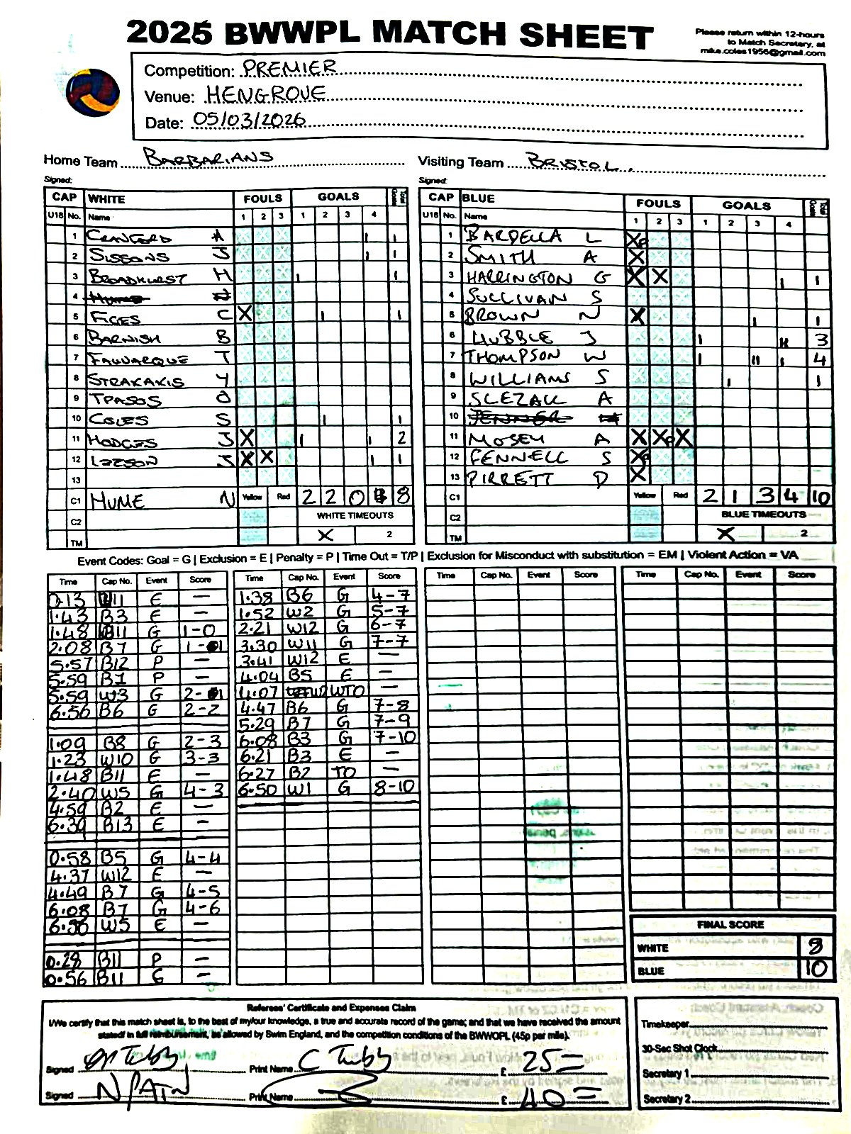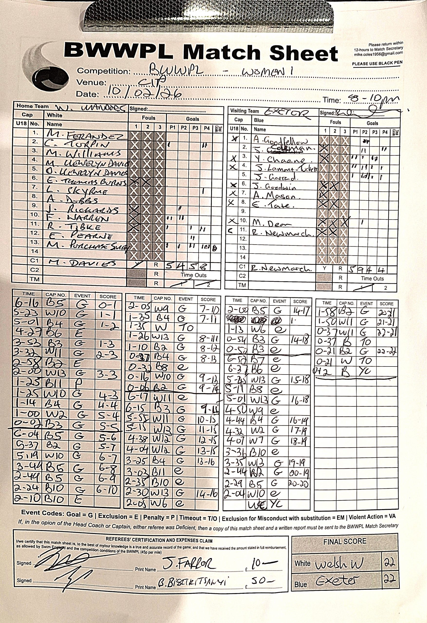 | Thr, 26 Feb 26 | City of Bristol | City of Bristol Barbarians | 15-15 | Hengrove Leisure Centre | Match Sheet | Thr, 5 Mar 26 | City of Bristol Barbarians | City of Bristol | 8-10 | Hengrove Leisure Centre | Match Sheet | Tue, 10 Mar 26 | Welsh Wanderers Women | Exeter Women | 22-22 | Cardiff International Pool | Match Sheet | Tue, 10 Mar 26 | City of Bristol Women | Newton Abbot Women | 5-0 | Hengrove Leisure Centre | Cancelled by Newton Abbot | Thr, 12 Mar 26 | Welsh Wanderers | City of Bristol Barbarians | 18-8 | Cardiff International Pool | Match Sheet | Sun, 22 Mar 26 | Weston-super-Mare | Newton Abbot | 18:30 | Hutton Moor Leisure Centre | Division 1 | S Tomlinson/C Selby | Thr, 26 Mar 26 | Welsh Wanderers II | Swansea | 19:45 | Cardiff International Pool | Division 1 | J Farror/N Paton | Thr, 26 Mar 26 | City of Bristol Harlequins | Bradford on Avon | 20:30 | Hengrove Leisure Centre | Division 2 | N Purslow/B Bisztritsányi | Tue, 31 Mar 26 | City of Bristol Women | Exeter Women | 20:30 | Hengrove Leisure Centre | Women's Division | J Farror/C Tubby | Thr, 2 Apr 26 | Welsh Wanderers II | Devonport Royal | 19:45 | Cardiff International Pool | Division 1 | J Farror/N Paton | Thr, 2 Apr 26 | City of Bristol Barbarians | Exeter | 20:30 | Hengrove Leisure Centre | Premier Division | N Purslow/B Bisztritsányi | Tue, 14 Apr 26 | Swansea | Welsh Wanderers II | 19:45 | Wales National Pool, Swansea | Division 1 | J Farror/N Davies | Thr, 16 Apr 26 | Welsh Wanderers II | Newton Abbot | 19:45 | Cardiff International Pool | Division 1 | B Bisztritsányi/C Tubby | Mon, 20 Apr 26 | Bradford on Avon | Swindon Dolphin | 20:30 | Bradford on Avon Swimming Pool | Division 2 | S Halstead/C Selby | Tue, 21 Apr 26 | Welsh Wanderers Women | City of Newport Women | 20:30 | Cardiff International Pool | Women's Division | J Sissons/S Halstead | Sat, 25 Apr 26 | City of Newport Women | City of Bristol Women | 16:00 | Newport International Pool | Women's Division | N Purslow/B Bisztritsanyi | Sat, 25 Apr 26 | City of Newport II | City of Bristol Harlequins | 17:30 | Newport International Pool | Division 2 | N Purslow/B Bisztritsanyi | Sun, 26 Apr 26 | Weston-super-Mare | Welsh Wanderers II | 18:30 | Hutton Moor Leisure Centre | Division 1 | S Tomlinson/P Whiting | Tue, 28 Apr 26 | Devonport Royal | Newton Abbot | 21:00 | Plymouth Life Centre | Division 1 | P Greedy/T Hogg | Thr, 30 Apr 26 | Welsh Wanderers II | Weston-super-Mare | 19:45 | Cardiff International Pool | Division 1 | N Paton/C Tubby | Tue, 5 May 26 | City of Bristol Women | City of Newport Women | 20:45 | Hengrove Leisure Centre | Women's Division | M Cooper/A Smith | Sat, 9 May 26 | City of Newport Women | Newton Abbot Women | 16:00 | Newport International Pool | Women's Division | Referees TBC | Sat, 9 May 26 | City of Newport | City of Bristol Barbarians | 17:30 | Newport International Pool | Premier Division | Referees TBC | Sun, 10 May 26 | Swindon Dolphin | Bradford on Avon | 13:00 | Marlborough College Swimming Pool | Division 2 ! Referees TBC | Sun, 10 May 26 | Weston-super-Mare | Devonport Royal | 18:30 | Hutton Moor Leisure Centre | Division 1 | Referees TBC | Wed, 13 May 26 | Exeter Women | Newton Abbot Women | 20:30 | St Sidwell’s Point Leisure Centre, Exeter | Women's Division | Referees TBC | Sat, 16 May 26 | City of Newport II | Swindon Dolphin | 17:30 | Newport International Pool | Division 2 | Referees TBC | Sun, 17 May 26 | Newton Abbot | Frome | 18:15 | Kingsteignton Swimming Pool | Division 1 | Referee TBC | Tue, 19 May 26 | Exeter | City of Bristol Barbarians | 20:30 | St Sidwell’s Point Leisure Centre, Exeter | Premier Division | Referees TBC | Thr, 21 May 26 | City of Bristol Harlequins | Swindon Dolphin | 20:30 | Hengrove Leisure Centre | Division 2 | Referees TBC | Thr, 21 May 26 | Frome | Weston-super-Mare | 20:30 | Frome Sports and Fitness Centre | Division One | Referees TBC | Tue, 26 May 26 | Swansea | Devonport Royal | 21:00 | Wales National Pool, Swansea | Division 1 | Referees TBC | Sat, 30 May 26 | City of Newport | Exeter | 17:30 | Newport International Pool | Premier League | Referees TBC | Sun, 31 May 26 | Swindon Dolphin | City of Newport II | 13:00 | Marlborough College Swimming Pool | Division 2 | Referees TBC | Sun, 31 May 26 | Newton Abbot Women | City of Newport Women | 18:15 | Kingsteignton Swimming Pool | Women's Division | Referees TBC | Mon, 1 Jun 26 | Bradford on Avon | City of Bristol Harlequins | 20:30 | Bradford on Avon Swimming Pool | Division 2 | Referees TBC | Tue, 2 Jun 26 | Swansea | Weston-super-Mare | 20:00 | Wales National Pool, Swansea | Division 1 | Referees TBC | Tue, 2 Jun 26 | Devonport Royal | Frome | 21:00 | Plymouth Life Centre | Division 1 | Referees TBC | Thr, 4 Jun 26 | City of Bristol Barbarians | City of Newport | 20:30 | Hengrove Leisure Centre | Premier Division | Referees TBC | Sun, 7 Jun 26 | Weymouth & Portland | Swindon Dolphin | 20:00 | Osprey Leisure Centre | Division 2 | Referees TBC | Thr, 11 Jun 26 | Frome | Newton Abbot | 20:30 | Frome Sports and Fitness Centre | Division 1 | Referees TBC | Thr, 11 Jun 26 | City of Bristol Harlequins | City of Newport II | 20:30 | Hengrove Leisure Centre | Division 2 | Referees TBC | Tue, 16 Jun 26 | Devonport Royal | Welsh Wanderers II | 20:45 | Plymouth Life Centre | Division 1 | Referees TBC | Sun, 21 Jun 26 | Newton Abbot Women | Welsh Wanderers Women | 13:15 | Kingsteignton Swimming Pool | Women's Division | Referees TBC | Sun, 21 Jun 26 | Weymouth & Portland | City of Bristol Harlequins | 20:00 | Osprey Leisure Centre | Division 2 | Referees TBC | Tue, 23 Jun 26 | Swansea | Newton Abbot | 20:00 | Wales National Pool, Swansea | Division 1 | Referees TBC | Thr, 25 Jun 26 | Frome | Welsh Wanderers II | 20:30 | Frome Sports and Fitness Centre | Division 1 | Referees TBC | Mon, 29 Jun 26 | Bradford on Avon | City of Newport II | 20:30 | Bradford on Avon Swimming Pool | Division 2 | Referees TBC | Tue, 30 Jun 26 | Exeter | C