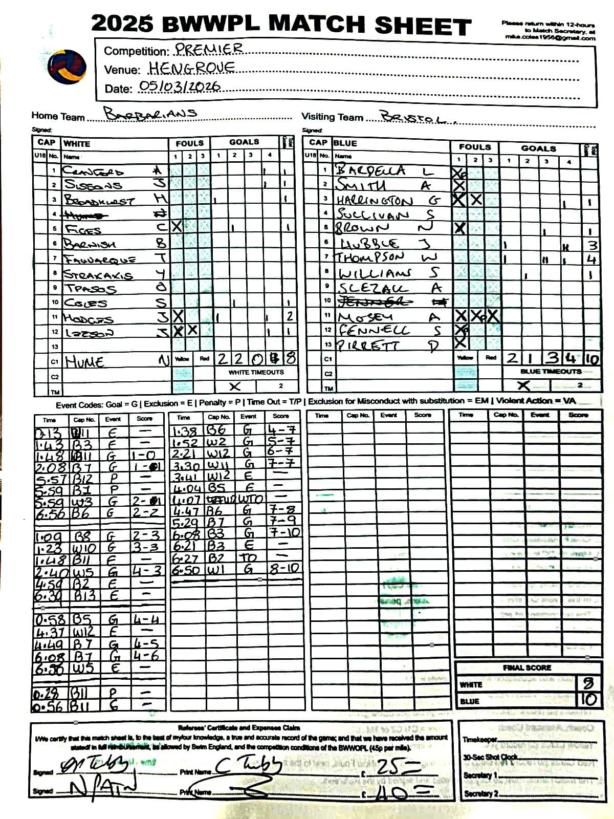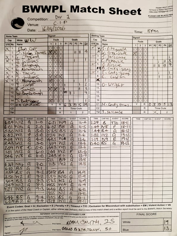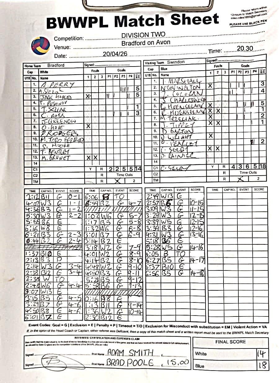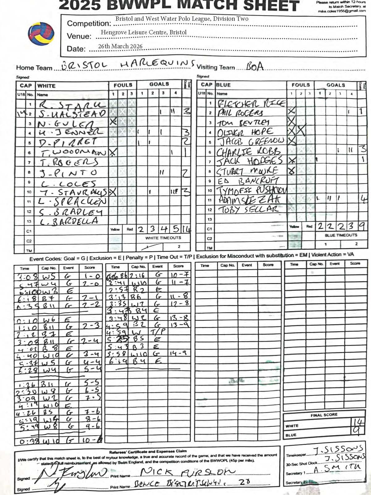 | Thr, 1 Jan 26 | City of Bristol Harlequins | Weston-super-Mare | TBA | Hengrove Leisure Centre | 2026 Men's KO Competition R2 TBA | Thr, 1 Jan 26 | Bradford on Avon | Devonport Royal | TBA | Bradford on Avon Swimming Pool | 2026 Senior Men's KO Comp | TBA | Thr, 26 Feb 26 | City of Bristol | City of Bristol Barbarians | 15-15 | Hengrove Leisure Centre | Match Sheet | Thr, 5 Mar 26 | City of Bristol Barbarians | City of Bristol | 8-10 | Hengrove Leisure Centre | Match Sheet | Tue, 10 Mar 26 | Welsh Wanderers Women | Exeter Women | 22-22 | Cardiff International Pool | Match Sheet | Tue, 10 Mar 26 | City of Bristol Women | Newton Abbot Women | 5-0 | Hengrove Leisure Centre | Cancelled by Newton Abbot | Thr, 12 Mar 26 | Welsh Wanderers | City of Bristol Barbarians | 18-8 | Cardiff International Pool | Match Sheet | Sun, 22 Mar 26 | Weston-super-Mare | Newton Abbot | 6-20 | Hutton Moor Leisure Centre | Match Sheet | Thr, 26 Mar 26 | Welsh Wanderers II | Swansea | 10-9 | Cardiff International Pool | Match Sheet | Thr, 26 Mar 26 | City of Bristol Harlequins | Bradford on Avon | 14-9 | Hengrove Leisure Centre | Match Sheet | Tue, 31 Mar 26 | City of Bristol Women | Exeter Women | 20-8 | Hengrove Leisure Centre | Match Sheet | Thr, 2 Apr 26 | Welsh Wanderers II | Devonport Royal | 5-0 | Cardiff International Pool | Game cancelled by Devonport Royal | Thr, 2 Apr 26 | City of Bristol Barbarians | Exeter | 16-10 | Hengrove Leisure Centre | Match Sheet | Tue, 14 Apr 26 | Swansea | Welsh Wanderers II | 10-19 | Wales National Pool, Swansea | Match Sheet | Thr, 16 Apr 26 | Welsh Wanderers II | Newton Abbot | 19-13 | Cardiff International Pool | Match Sheet | Mon, 20 Apr 26 | Bradford on Avon | Swindon Dolphin | 14-18 | Bradford on Avon Swimming Pool | Match Sheet | Tue, 21 Apr 26 | Welsh Wanderers Women | City of Newport Women | 5-0 | Cardiff International Pool | Match Cancelled by City of Newport | Sat, 25 Apr 26 | City of Newport Women | City of Bristol Women | 16:00 | Newport International Pool | Women's Division | N Purslow/B Bisztritsanyi | Sat, 25 Apr 26 | City of Newport II | City of Bristol Harlequins | 17:30 | Newport International Pool | Division 2 | N Purslow/B Bisztritsanyi | Sun, 26 Apr 26 | Weston-super-Mare | Welsh Wanderers II | 18:30 | Hutton Moor Leisure Centre | Division 1 | S Tomlinson/P Whiting | Tue, 28 Apr 26 | Devonport Royal | Newton Abbot | 21:00 | Plymouth Life Centre | Division 1 | P Greedy/T Hogg | Thr, 30 Apr 26 | Welsh Wanderers II | Weston-super-Mare | 19:45 | Cardiff International Pool | Division 1 | N Paton/C Tubby | Tue, 5 May 26 | City of Bristol Women | City of Newport Women | 5-0 | Hengrove Leisure Centre | Cancelled by City of Newport | Sat, 9 May 26 | City of Newport Women | Newton Abbot Women | 16:00 | Newport International Pool | Women's Division | B Bisztritsányi/N Purslow | Sat, 9 May 26 | City of Newport | City of Bristol Barbarians | 17:30 | Newport International Pool | Premier Division | B Bisztritsányi/N Purslow | Sun, 10 May 26 | Swindon Dolphin | Bradford on Avon | 13:00 | Marlborough College Swimming Pool | Division 2 ! B Poole/S Halstead | Sun, 10 May 26 | Weston-super-Mare | Devonport Royal | 18:30 | Hutton Moor Leisure Centre | Division 1 | S Tomlinson/J Sissions | Wed, 13 May 26 | Exeter Women | Newton Abbot Women | 20:30 | St Sidwell’s Point Leisure Centre, Exeter | Women's Division | C Pryke/D Murphy | Sat, 16 May 26 | City of Newport II | Swindon Dolphin | 17:30 | Newport International Pool | Division 2 | J Sissons/S Halstead | Sun, 17 May 26 | Newton Abbot | Frome | 18:15 | Kingsteignton Swimming Pool | Division 1 | S Tomlinson/P Greedy | Tue, 19 May 26 | Swansea | City of Newport | 20:00 | Wales National Pool, Swansea | 2026 Senior Men KO Competition R1 | N Davies/D Ward | Tue, 19 May 26 | Exeter | City of Bristol Barbarians | 20:30 | St Sidwell’s Point Leisure Centre, Exeter | Premier Division | D Murphy/R Tamlyn | Thr, 21 May 26 | City of Bristol Harlequins | Swindon Dolphin | 20:30 | Hengrove Leisure Centre | Division 2 | B Bisztritsányi/N Paton | Thr, 21 May 26 | Frome | Weston-super-Mare | 20:30 | Frome Sports and Fitness Centre | Division One | C Pryke/D Murphy | Tue, 26 May 26 | Swansea | Devonport Royal | 21:00 | Wales National Pool, Swansea | Division 1 | D Ward/J Farror | Sat, 30 May 26 | City of Newport | Exeter | 17:30 | Newport International Pool | Premier League | C Selby/C Tubby | Sun, 31 May 26 | Swindon Dolphin | City of Newport II | 13:00 | Marlborough College Swimming Pool | Division 2 | B Bisztritsányi/N Purslow | Sun, 31 May 26 | Newton Abbot Women | City of Newport Women | 18:15 | Kingsteignton Swimming Pool | Women's Division | P Greedy/J Amado | Mon, 1 Jun 26 | Bradford on Avon | City of Bristol Harlequins | 20:30 | Bradford on Avon Swimming Pool | Division 2 | C Selby/B Bisztritsányi | Tue, 2 Jun 26 | Swansea | Weston-super-Mare | 20:00 | Wales National Pool, Swansea | Division 1 | J Farror/J Griffiths | Tue, 2 Jun 26 | Devonport Royal | Frome | 21:00 | Plymouth Life Centre | Division 1 | T Bossom/R Tamlyn | Thr, 4 Jun 26 | City of Bristol Barbarians | City of Newport | 20:30 | Hengrove Leisure Centre | Premier Division | N Paton/C Tubby | Sun, 7 Jun 26 | Weymouth & Portland | Swindon Dolphin | 20:00 | Osprey Leisure Centre | Division 2 | D Murphy/C Pryke | Thr, 11 Jun 26 | Frome | Newton Abbot | 20:30 | Frome Sports and Fitness Centre | Division 1 | C Selby/J Sissons | Thr, 11 Jun 26 | City of Bristol Harlequins | City of Newport II | 20:30 | Hengrove Leisure Centre | Division 2 | B Bisztritsányi/N Purslow | Tue, 16 Jun 26 | Devonport Royal | Welsh Wanderers II | 20:45 | Plymouth Life Centre | Division 1 | R Tamlyn/J Trist | Sun, 21 Jun 26 | Newton Abbot Women | Welsh Wanderers Women | 18:30 | Kingsteignton Swimming Pool | Women's Division | A Older/T Bossom | Sun, 21 Jun 26 | Weymouth & Portland | City of Bristol Harlequins | 20:00 | Osprey Leisure Centre | Division 2 | C Selby/D Murphy | Tue, 23 Jun 26 | 