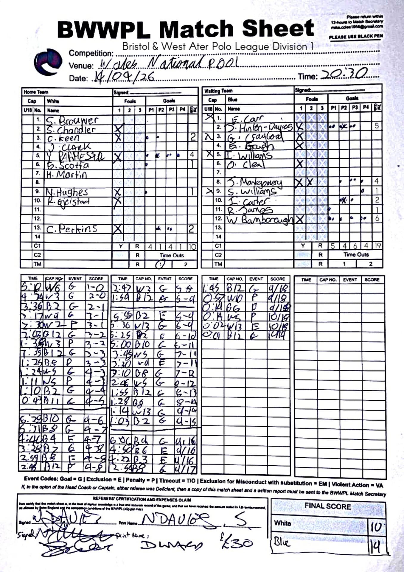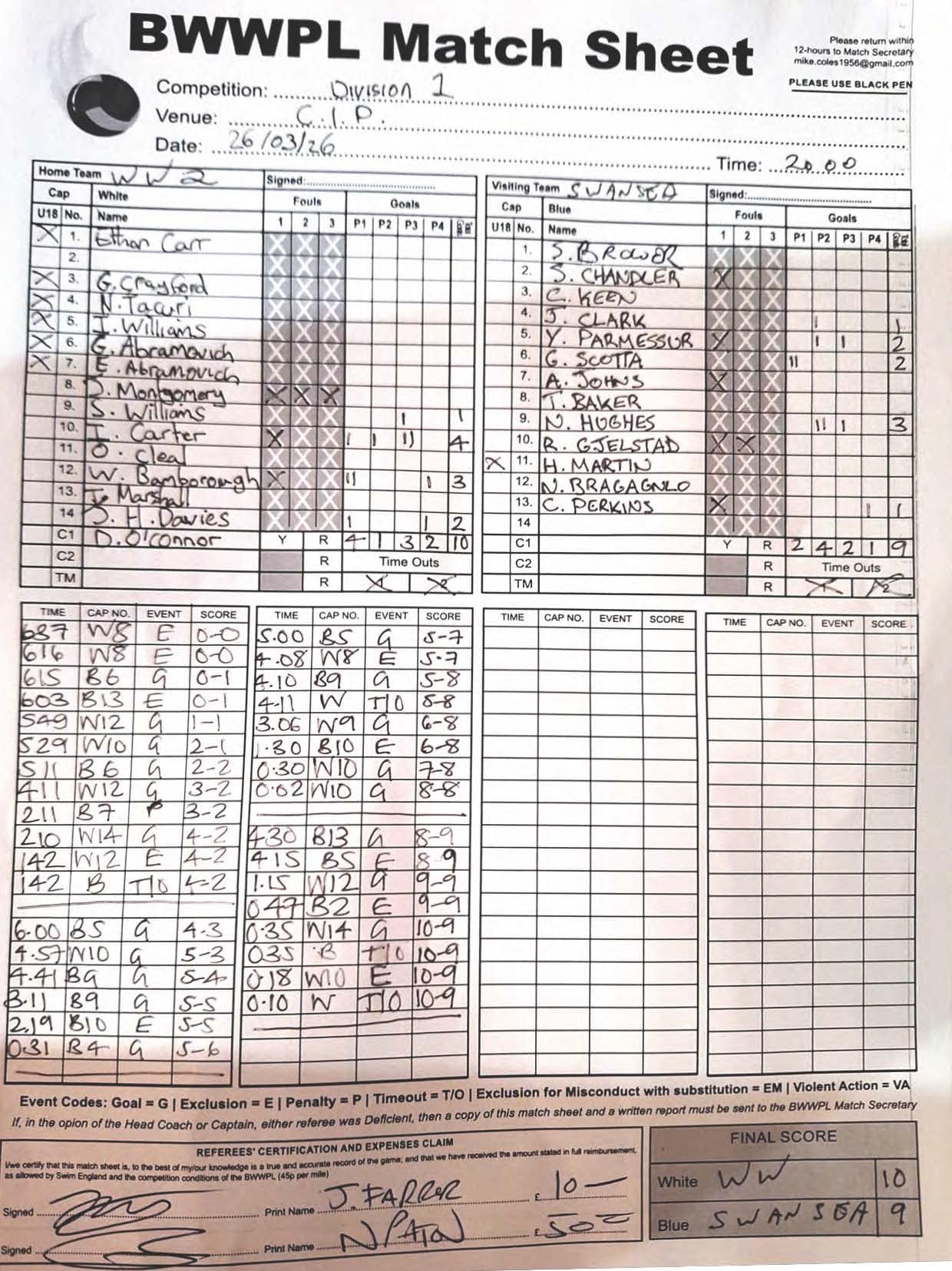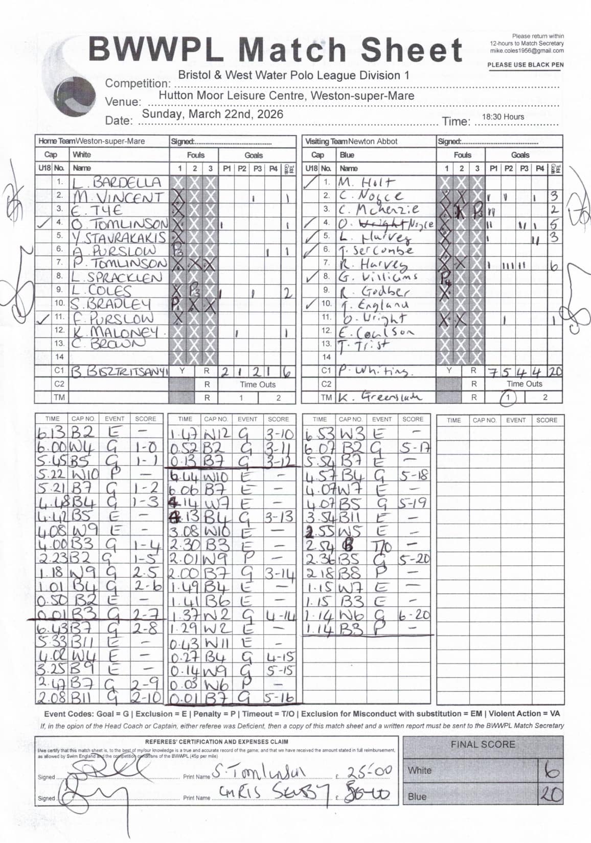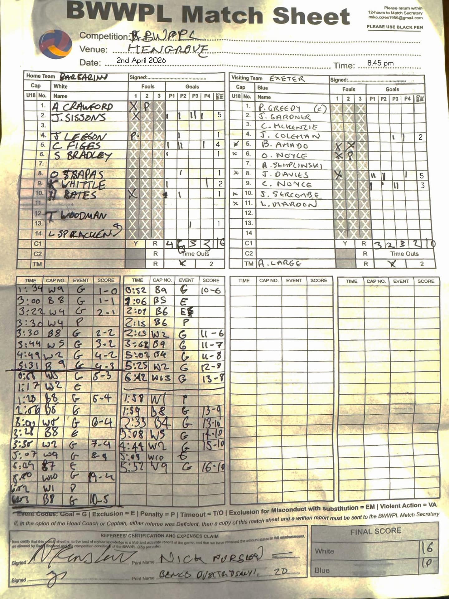 | Thr, 1 Jan 26 | City of Bristol Harlequins | Weston-super-Mare | TBA | Hengrove Leisure Centre | 2026 Men's KO Competition R2 TBA | Thr, 1 Jan 26 | Bradford on Avon | Devonport Royal | TBA | Bradford on Avon Swimming Pool | 2026 Senior Men's KO Comp | TBA | Thr, 26 Feb 26 | City of Bristol | City of Bristol Barbarians | 15-15 | Hengrove Leisure Centre | Match Sheet | Thr, 5 Mar 26 | City of Bristol Barbarians | City of Bristol | 8-10 | Hengrove Leisure Centre | Match Sheet | Tue, 10 Mar 26 | Welsh Wanderers Women | Exeter Women | 22-22 | Cardiff International Pool | Match Sheet | Tue, 10 Mar 26 | City of Bristol Women | Newton Abbot Women | 5-0 | Hengrove Leisure Centre | Cancelled by Newton Abbot | Thr, 12 Mar 26 | Welsh Wanderers | City of Bristol Barbarians | 18-8 | Cardiff International Pool | Match Sheet | Sun, 22 Mar 26 | Weston-super-Mare | Newton Abbot | 6-20 | Hutton Moor Leisure Centre | Match Sheet | Thr, 26 Mar 26 | Welsh Wanderers II | Swansea | 10-9 | Cardiff International Pool | Match Sheet | Thr, 26 Mar 26 | City of Bristol Harlequins | Bradford on Avon | 14-9 | Hengrove Leisure Centre | Match Sheet | Tue, 31 Mar 26 | City of Bristol Women | Exeter Women | 20-8 | Hengrove Leisure Centre | Match Sheet | Thr, 2 Apr 26 | Welsh Wanderers II | Devonport Royal | 5-0 | Cardiff International Pool | Game cancelled by Devonport Royal | Thr, 2 Apr 26 | City of Bristol Barbarians | Exeter | 16-10 | Hengrove Leisure Centre | Match Sheet | Tue, 14 Apr 26 | Swansea | Welsh Wanderers II | 10-19 | Wales National Pool, Swansea | Match Sheet | Thr, 16 Apr 26 | Welsh Wanderers II | Newton Abbot | 19-13 | Cardiff International Pool | Match Sheet | Mon, 20 Apr 26 | Bradford on Avon | Swindon Dolphin | 14-18 | Bradford on Avon Swimming Pool | Match Sheet | Tue, 21 Apr 26 | Welsh Wanderers Women | City of Newport Women | 5-0 | Cardiff International Pool | Match Cancelled by City of Newport | Sat, 25 Apr 26 | City of Newport Women | City of Bristol Women | 16:00 | Newport International Pool | Women's Division | N Purslow/B Bisztritsanyi | Sat, 25 Apr 26 | City of Newport II | City of Bristol Harlequins | 17:30 | Newport International Pool | Division 2 | N Purslow/B Bisztritsanyi | Sun, 26 Apr 26 | Weston-super-Mare | Welsh Wanderers II | 18:30 | Hutton Moor Leisure Centre | Division 1 | S Tomlinson/P Whiting | Tue, 28 Apr 26 | Devonport Royal | Newton Abbot | 21:00 | Plymouth Life Centre | Division 1 | P Greedy/T Hogg | Thr, 30 Apr 26 | Welsh Wanderers II | Weston-super-Mare | 19:45 | Cardiff International Pool | Division 1 | N Paton/C Tubby | Tue, 5 May 26 | City of Bristol Women | City of Newport Women | 5-0 | Hengrove Leisure Centre | Cancelled by City of Newport | Sat, 9 May 26 | City of Newport Women | Newton Abbot Women | 16:00 | Newport International Pool | Women's Division | B Bisztritsányi/N Purslow | Sat, 9 May 26 | City of Newport | City of Bristol Barbarians | 17:30 | Newport International Pool | Premier Division | B Bisztritsányi/N Purslow | Sun, 10 May 26 | Swindon Dolphin | Bradford on Avon | 13:00 | Marlborough College Swimming Pool | Division 2 ! B Poole/S Halstead | Sun, 10 May 26 | Weston-super-Mare | Devonport Royal | 18:30 | Hutton Moor Leisure Centre | Division 1 | S Tomlinson/J Sissions | Wed, 13 May 26 | Exeter Women | Newton Abbot Women | 20:30 | St Sidwell’s Point Leisure Centre, Exeter | Women's Division | C Pryke/D Murphy | Sat, 16 May 26 | City of Newport II | Swindon Dolphin | 17:30 | Newport International Pool | Division 2 | J Sissons/S Halstead | Sun, 17 May 26 | Newton Abbot | Frome | 18:15 | Kingsteignton Swimming Pool | Division 1 | S Tomlinson/P Greedy | Tue, 19 May 26 | Swansea | City of Newport | 20:00 | Wales National Pool, Swansea | 2026 Senior Men KO Competition R1 | N Davies/D Ward | Tue, 19 May 26 | Exeter | City of Bristol Barbarians | 20:30 | St Sidwell’s Point Leisure Centre, Exeter | Premier Division | D Murphy/R Tamlyn | Thr, 21 May 26 | City of Bristol Harlequins | Swindon Dolphin | 20:30 | Hengrove Leisure Centre | Division 2 | B Bisztritsányi/N Paton | Thr, 21 May 26 | Frome | Weston-super-Mare | 20:30 | Frome Sports and Fitness Centre | Division One | C Pryke/D Murphy | Tue, 26 May 26 | Swansea | Devonport Royal | 21:00 | Wales National Pool, Swansea | Division 1 | D Ward/J Farror | Sat, 30 May 26 | City of Newport | Exeter | 17:30 | Newport International Pool | Premier League | C Selby/C Tubby | Sun, 31 May 26 | Swindon Dolphin | City of Newport II | 13:00 | Marlborough College Swimming Pool | Division 2 | B Bisztritsányi/N Purslow | Sun, 31 May 26 | Newton Abbot Women | City of Newport Women | 18:15 | Kingsteignton Swimming Pool | Women's Division | P Greedy/J Amado | Mon, 1 Jun 26 | Bradford on Avon | City of Bristol Harlequins | 20:30 | Bradford on Avon Swimming Pool | Division 2 | C Selby/B Bisztritsányi | Tue, 2 Jun 26 | Swansea | Weston-super-Mare | 20:00 | Wales National Pool, Swansea | Division 1 | J Farror/J Griffiths | Tue, 2 Jun 26 | Devonport Royal | Frome | 21:00 | Plymouth Life Centre | Division 1 | T Bossom/R Tamlyn | Thr, 4 Jun 26 | City of Bristol Barbarians | City of Newport | 20:30 | Hengrove Leisure Centre | Premier Division | N Paton/C Tubby | Sun, 7 Jun 26 | Weymouth & Portland | Swindon Dolphin | 20:00 | Osprey Leisure Centre | Division 2 | D Murphy/C Pryke | Thr, 11 Jun 26 | Frome | Newton Abbot | 20:30 | Frome Sports and Fitness Centre | Division 1 | C Selby/J Sissons | Thr, 11 Jun 26 | City of Bristol Harlequins | City of Newport II | 20:30 | Hengrove Leisure Centre | Division 2 | B Bisztritsányi/N Purslow | Tue, 16 Jun 26 | Devonport Royal | Welsh Wanderers II | 20:45 | Plymouth Life Centre | Division 1 | R Tamlyn/J Trist | Sun, 21 Jun 26 | Newton Abbot Women | Welsh Wanderers Women | 18:30 | Kingsteignton Swimming Pool | Women's Division | A Older/T Bossom | Sun, 21 Jun 26 | Weymouth & Portland | City of Bristol Harlequins | 20:00 | Osprey Leisure Centre | Division 2 | C Selby/D Murphy | Tue, 23 Jun 26 | 