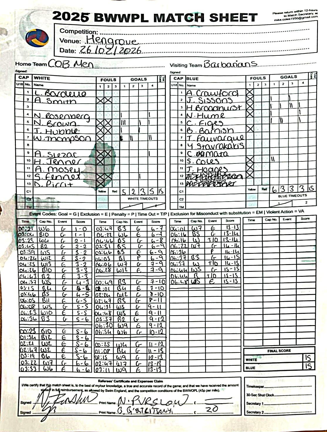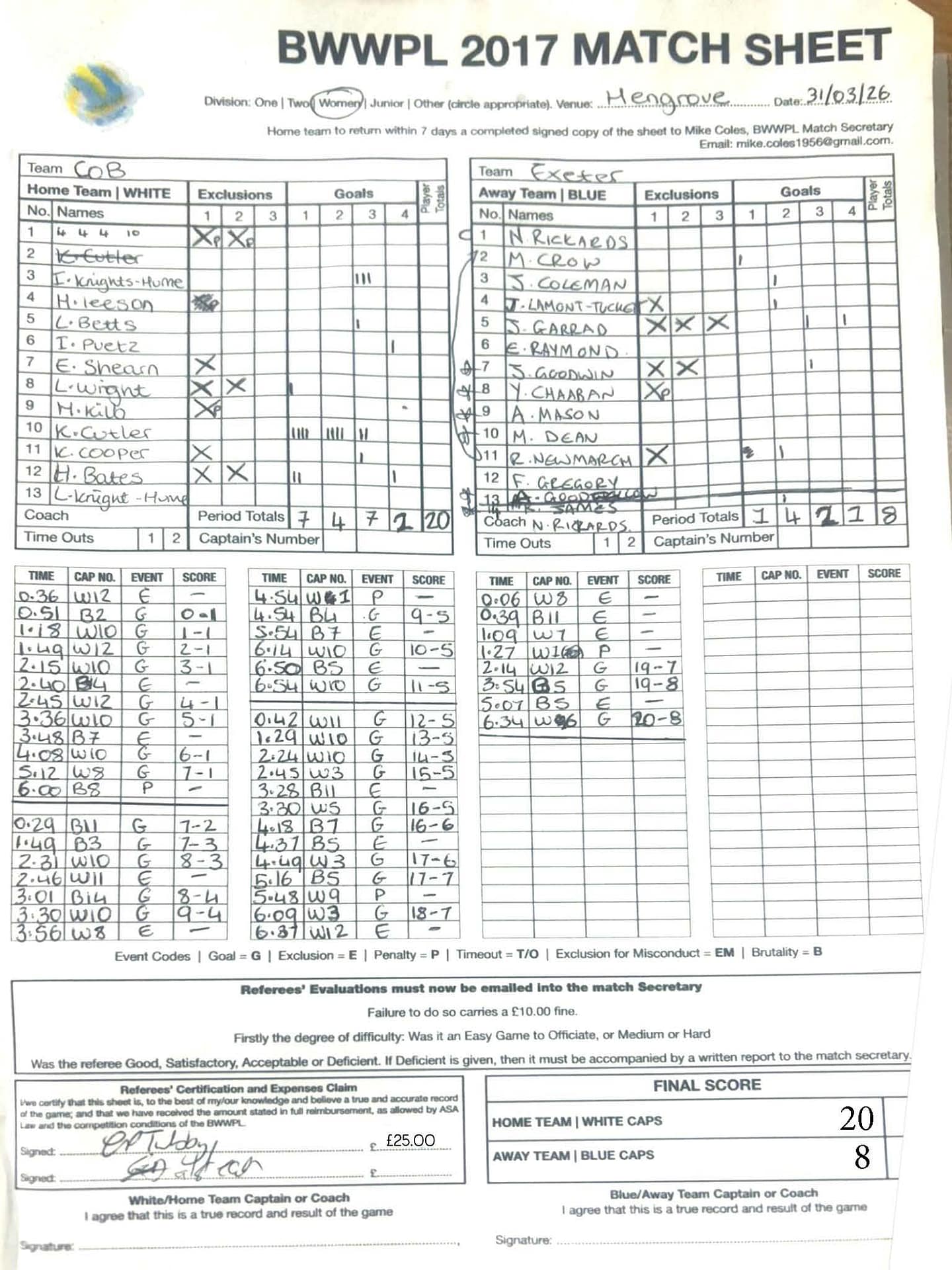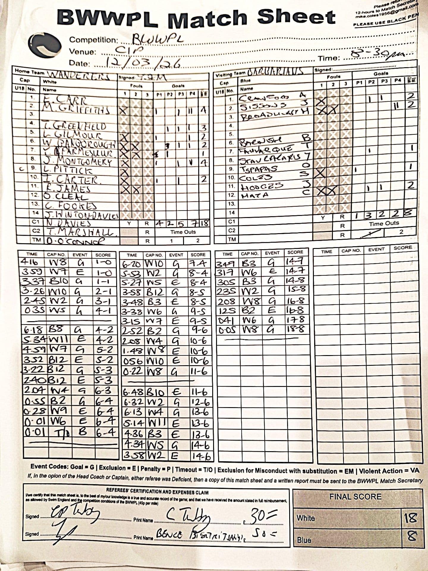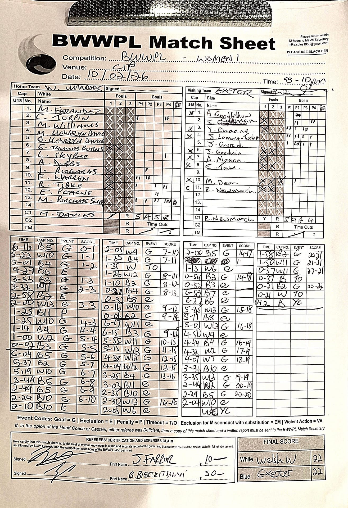 | Thr, 1 Jan 26 | City of Bristol Harlequins | Weston-super-Mare | TBA | Hengrove Leisure Centre | 2026 Men's KO Competition R2 TBA | Thr, 1 Jan 26 | Bradford on Avon | Devonport Royal | TBA | Bradford on Avon Swimming Pool | 2026 Senior Men's KO Comp | TBA | Thr, 26 Feb 26 | City of Bristol | City of Bristol Barbarians | 15-15 | Hengrove Leisure Centre | Match Sheet | Thr, 5 Mar 26 | City of Bristol Barbarians | City of Bristol | 8-10 | Hengrove Leisure Centre | Match Sheet | Tue, 10 Mar 26 | Welsh Wanderers Women | Exeter Women | 22-22 | Cardiff International Pool | Match Sheet | Tue, 10 Mar 26 | City of Bristol Women | Newton Abbot Women | 5-0 | Hengrove Leisure Centre | Cancelled by Newton Abbot | Thr, 12 Mar 26 | Welsh Wanderers | City of Bristol Barbarians | 18-8 | Cardiff International Pool | Match Sheet | Sun, 22 Mar 26 | Weston-super-Mare | Newton Abbot | 6-20 | Hutton Moor Leisure Centre | Match Sheet | Thr, 26 Mar 26 | Welsh Wanderers II | Swansea | 10-9 | Cardiff International Pool | Match Sheet | Thr, 26 Mar 26 | City of Bristol Harlequins | Bradford on Avon | 14-9 | Hengrove Leisure Centre | Match Sheet | Tue, 31 Mar 26 | City of Bristol Women | Exeter Women | 20-8 | Hengrove Leisure Centre | Match Sheet | Thr, 2 Apr 26 | Welsh Wanderers II | Devonport Royal | 5-0 | Cardiff International Pool | Game cancelled by Devonport Royal | Thr, 2 Apr 26 | City of Bristol Barbarians | Exeter | 16-10 | Hengrove Leisure Centre | Match Sheet | Tue, 14 Apr 26 | Swansea | Welsh Wanderers II | 10-19 | Wales National Pool, Swansea | Match Sheet | Thr, 16 Apr 26 | Welsh Wanderers II | Newton Abbot | 19-13 | Cardiff International Pool | Match Sheet | Mon, 20 Apr 26 | Bradford on Avon | Swindon Dolphin | 14-18 | Bradford on Avon Swimming Pool | Match Sheet | Tue, 21 Apr 26 | Welsh Wanderers Women | City of Newport Women | 5-0 | Cardiff International Pool | Match Cancelled by City of Newport | Sat, 25 Apr 26 | City of Newport Women | City of Bristol Women | 16:00 | Newport International Pool | Women's Division | N Purslow/B Bisztritsanyi | Sat, 25 Apr 26 | City of Newport II | City of Bristol Harlequins | 17:30 | Newport International Pool | Division 2 | N Purslow/B Bisztritsanyi | Sun, 26 Apr 26 | Weston-super-Mare | Welsh Wanderers II | 18:30 | Hutton Moor Leisure Centre | Division 1 | S Tomlinson/P Whiting | Tue, 28 Apr 26 | Devonport Royal | Newton Abbot | 21:00 | Plymouth Life Centre | Division 1 | P Greedy/T Hogg | Thr, 30 Apr 26 | Welsh Wanderers II | Weston-super-Mare | 19:45 | Cardiff International Pool | Division 1 | N Paton/C Tubby | Tue, 5 May 26 | City of Bristol Women | City of Newport Women | 5-0 | Hengrove Leisure Centre | Cancelled by City of Newport | Sat, 9 May 26 | City of Newport Women | Newton Abbot Women | 16:00 | Newport International Pool | Women's Division | B Bisztritsányi/N Purslow | Sat, 9 May 26 | City of Newport | City of Bristol Barbarians | 17:30 | Newport International Pool | Premier Division | B Bisztritsányi/N Purslow | Sun, 10 May 26 | Swindon Dolphin | Bradford on Avon | 13:00 | Marlborough College Swimming Pool | Division 2 ! B Poole/S Halstead | Sun, 10 May 26 | Weston-super-Mare | Devonport Royal | 18:30 | Hutton Moor Leisure Centre | Division 1 | S Tomlinson/J Sissions | Wed, 13 May 26 | Exeter Women | Newton Abbot Women | 20:30 | St Sidwell’s Point Leisure Centre, Exeter | Women's Division | C Pryke/D Murphy | Sat, 16 May 26 | City of Newport II | Swindon Dolphin | 17:30 | Newport International Pool | Division 2 | J Sissons/S Halstead | Sun, 17 May 26 | Newton Abbot | Frome | 18:15 | Kingsteignton Swimming Pool | Division 1 | S Tomlinson/P Greedy | Tue, 19 May 26 | Swansea | City of Newport | 20:00 | Wales National Pool, Swansea | 2026 Senior Men KO Competition R1 | N Davies/D Ward | Tue, 19 May 26 | Exeter | City of Bristol Barbarians | 20:30 | St Sidwell’s Point Leisure Centre, Exeter | Premier Division | D Murphy/R Tamlyn | Thr, 21 May 26 | City of Bristol Harlequins | Swindon Dolphin | 20:30 | Hengrove Leisure Centre | Division 2 | B Bisztritsányi/N Paton | Thr, 21 May 26 | Frome | Weston-super-Mare | 20:30 | Frome Sports and Fitness Centre | Division One | C Pryke/D Murphy | Tue, 26 May 26 | Swansea | Devonport Royal | 21:00 | Wales National Pool, Swansea | Division 1 | D Ward/J Farror | Sat, 30 May 26 | City of Newport | Exeter | 17:30 | Newport International Pool | Premier League | C Selby/C Tubby | Sun, 31 May 26 | Swindon Dolphin | City of Newport II | 13:00 | Marlborough College Swimming Pool | Division 2 | B Bisztritsányi/N Purslow | Sun, 31 May 26 | Newton Abbot Women | City of Newport Women | 18:15 | Kingsteignton Swimming Pool | Women's Division | P Greedy/J Amado | Mon, 1 Jun 26 | Bradford on Avon | City of Bristol Harlequins | 20:30 | Bradford on Avon Swimming Pool | Division 2 | C Selby/B Bisztritsányi | Tue, 2 Jun 26 | Swansea | Weston-super-Mare | 20:00 | Wales National Pool, Swansea | Division 1 | J Farror/J Griffiths | Tue, 2 Jun 26 | Devonport Royal | Frome | 21:00 | Plymouth Life Centre | Division 1 | T Bossom/R Tamlyn | Thr, 4 Jun 26 | City of Bristol Barbarians | City of Newport | 20:30 | Hengrove Leisure Centre | Premier Division | N Paton/C Tubby | Sun, 7 Jun 26 | Weymouth & Portland | Swindon Dolphin | 20:00 | Osprey Leisure Centre | Division 2 | D Murphy/C Pryke | Thr, 11 Jun 26 | Frome | Newton Abbot | 20:30 | Frome Sports and Fitness Centre | Division 1 | C Selby/J Sissons | Thr, 11 Jun 26 | City of Bristol Harlequins | City of Newport II | 20:30 | Hengrove Leisure Centre | Division 2 | B Bisztritsányi/N Purslow | Tue, 16 Jun 26 | Devonport Royal | Welsh Wanderers II | 20:45 | Plymouth Life Centre | Division 1 | R Tamlyn/J Trist | Sun, 21 Jun 26 | Newton Abbot Women | Welsh Wanderers Women | 18:30 | Kingsteignton Swimming Pool | Women's Division | A Older/T Bossom | Sun, 21 Jun 26 | Weymouth & Portland | City of Bristol Harlequins | 20:00 | Osprey Leisure Centre | Division 2 | C Selby/D Murphy | Tue, 23 Jun 26 | 